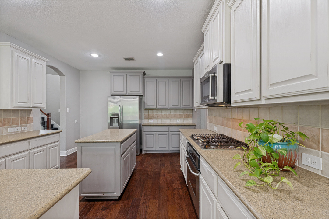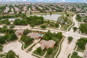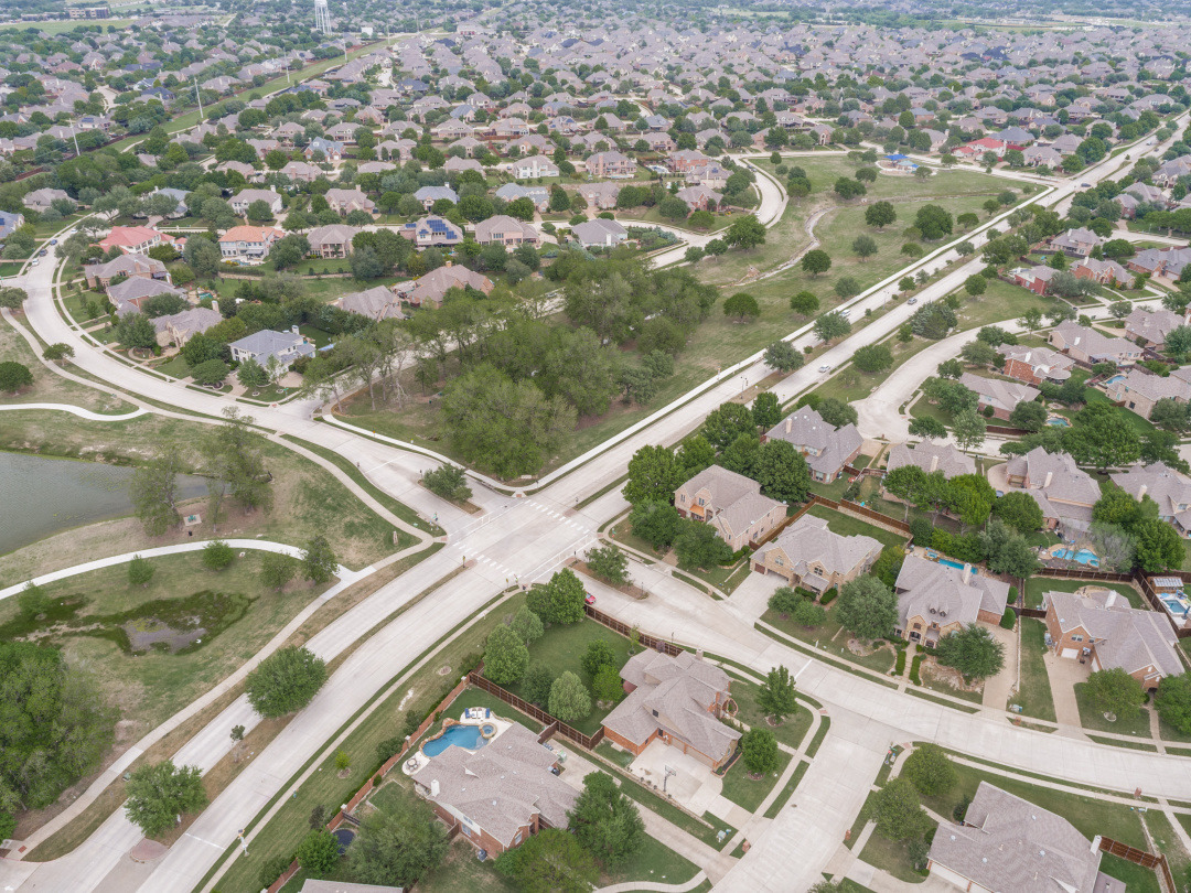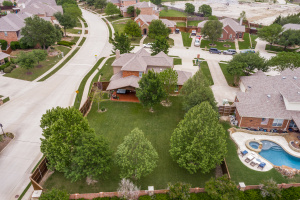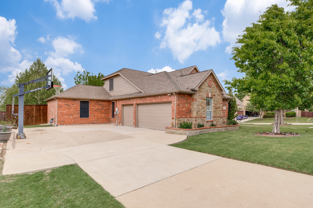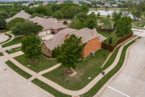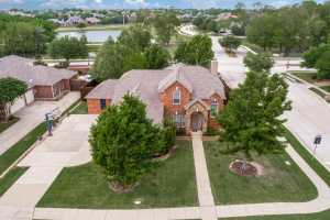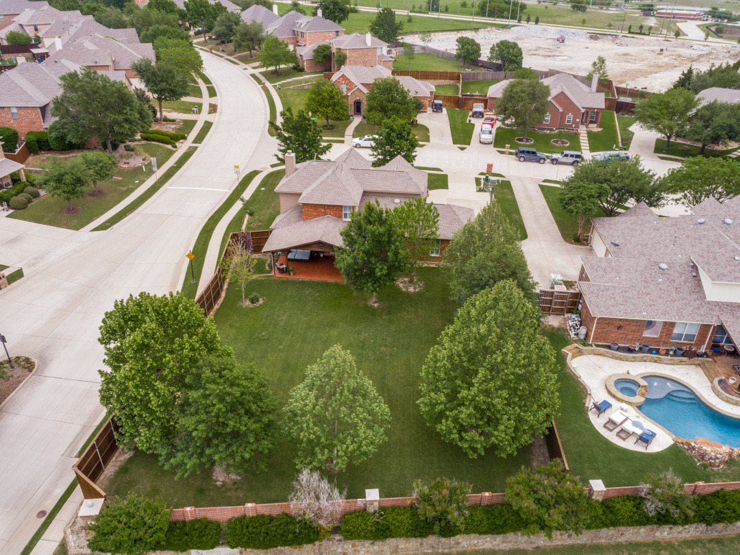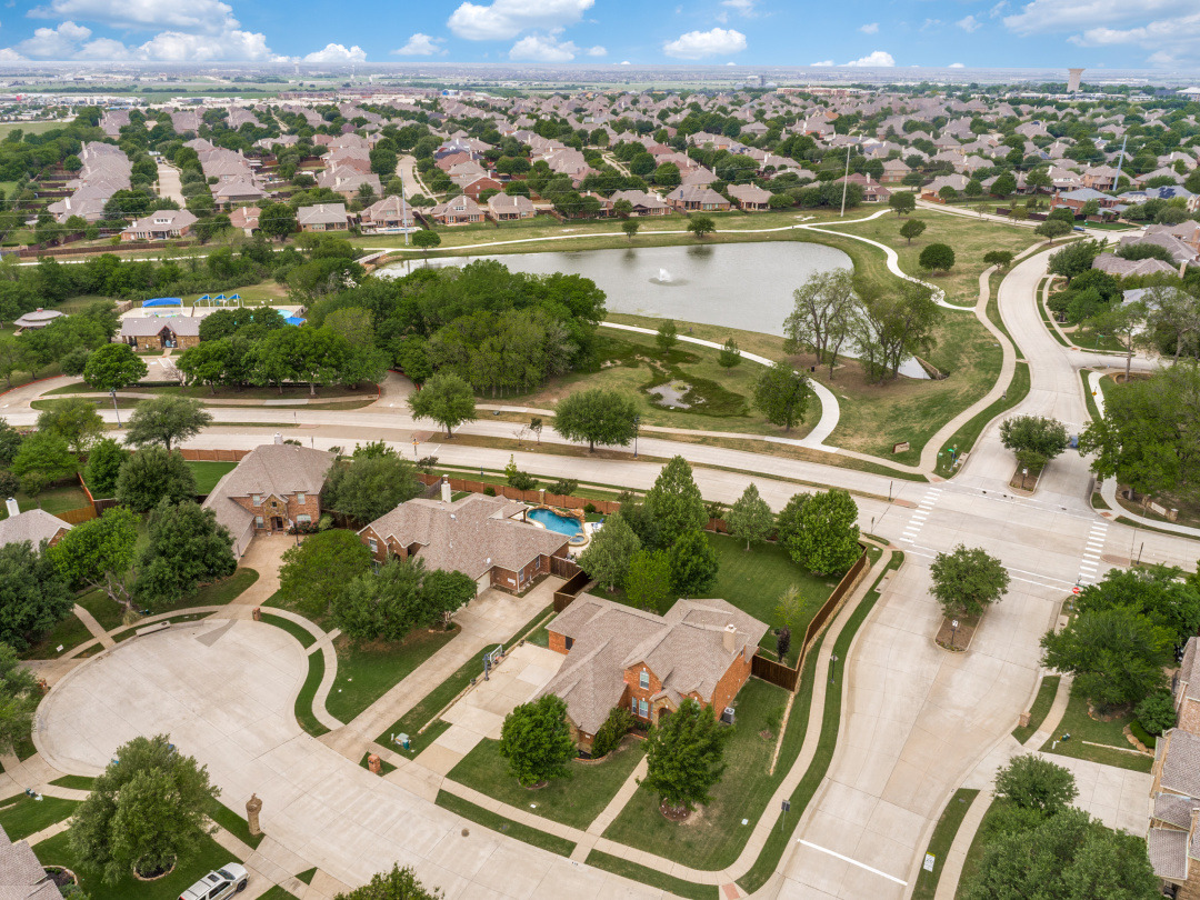 Lying situated on an enormous corner lot in a quiet cul-de-sac, this single-owner home has been meticulously maintained and backs up to Pecan Grove Park. The 20+ acre park encompasses a fishing lake, plenty of trails, and a playground complete with pavilion and picnic tables, all within just a short distance from your front door. The community pool lies adjacent to the park, providing another avenue of entertainment to be found right at your fingertips. The covered back patio enjoys panoramic views of much of this, including the expansive backyard shaded by numerous mature trees. The yard is surrounded by a recent 9’ wood fence, with brick fence at back maintained by the HOA. The home itself boasts a large island kitchen equipped with tons of counters and cabinet space, plus stainless-steel appliances including a gas range, all open to the dining and living areas. The spacious dining area is provided with spectacular views of the backyard and lake beyond. Giant living area is outfitted with a fireplace with gas logs. Big downstairs master bedroom is served by a luxury bath accoutered with jetted tub, separate shower, dual sinks, vanity, and walk-in closet. Also, downstairs is a secondary bedroom and office with glass front French doors. Designer carpet has been installed at the stairs leading up to the upstairs retreat which contains four more bedrooms, two adjoined by a jack-and-jill bath, while another full bath services the other two. Handsome wood flooring adorns much of the downstairs with gorgeous plantation shutters found throughout. Another nice feature is the floored attic space accessible through an upstairs door and the mudroom separating the oversized 3-car garage from the rest of the home. Additional parking pad at the side-entry garage is complemented by built-in basketball hoop. Long-established neighborhood of The Lakes of La Cima, with NO MUD or PID, provides easy access to a multitude of shopping and entertainment venues along HWY 380 and Preston.