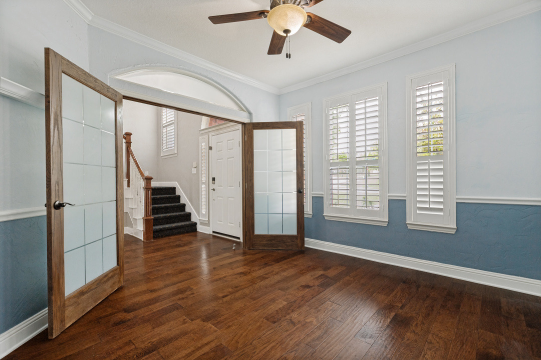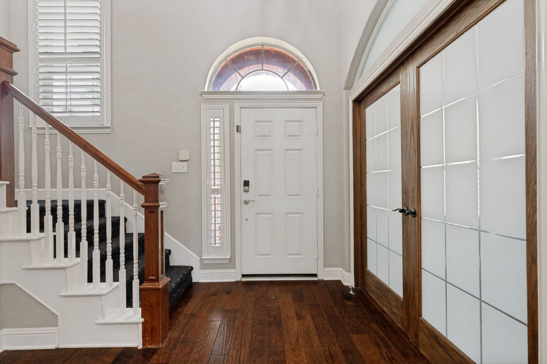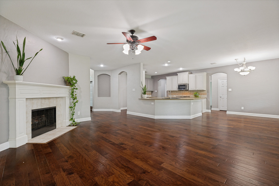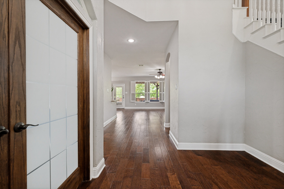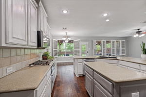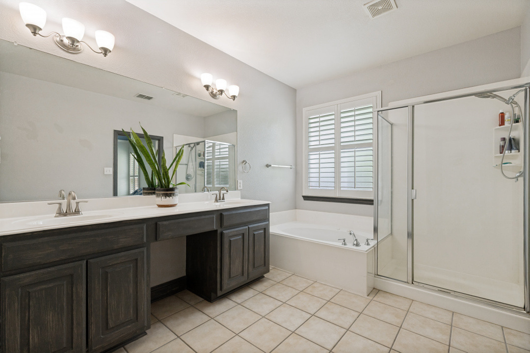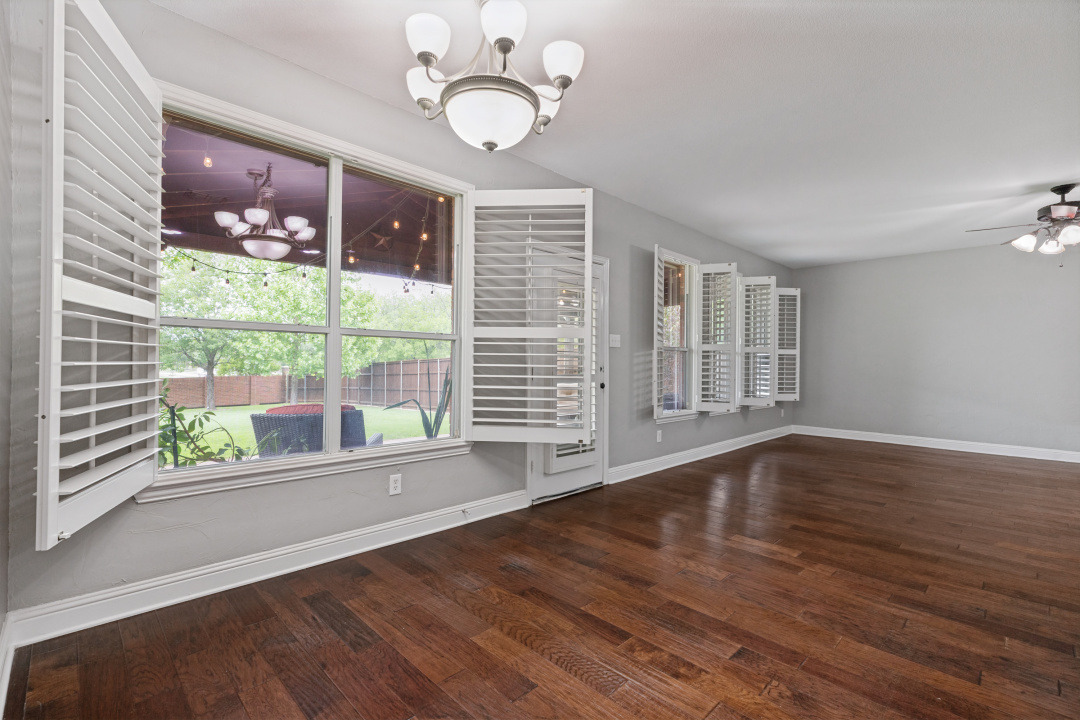 Lying situated on an enormous corner lot in a quiet cul-de-sac, this single-owner home has been meticulously maintained and backs up to Pecan Grove Park. The 20+ acre park encompasses a fishing lake, plenty of trails, and a playground complete with pavilion and picnic tables, all within just a short distance from your front door. The community pool lies adjacent to the park, providing another avenue of entertainment to be found right at your fingertips. The covered back patio enjoys panoramic views of much of this, including the expansive backyard shaded by numerous mature trees. The yard is surrounded by a recent 9’ wood fence, with brick fence at back maintained by the HOA. The home itself boasts a large island kitchen equipped with tons of counters and cabinet space, plus stainless-steel appliances including a gas range, all open to the dining and living areas. The spacious dining area is provided with spectacular views of the backyard and lake beyond. Giant living area is outfitted with a fireplace with gas logs. Big downstairs master bedroom is served by a luxury bath accoutered with jetted tub, separate shower, dual sinks, vanity, and walk-in closet. Also, downstairs is a secondary bedroom and office with glass front French doors. Designer carpet has been installed at the stairs leading up to the upstairs retreat which contains four more bedrooms, two adjoined by a jack-and-jill bath, while another full bath services the other two. Handsome wood flooring adorns much of the downstairs with gorgeous plantation shutters found throughout. Another nice feature is the floored attic space accessible through an upstairs door and the mudroom separating the oversized 3-car garage from the rest of the home. Additional parking pad at the side-entry garage is complemented by built-in basketball hoop. Long-established neighborhood of The Lakes of La Cima, with NO MUD or PID, provides easy access to a multitude of shopping and entertainment venues along HWY 380 and Preston.