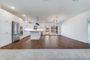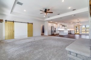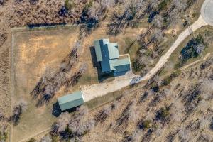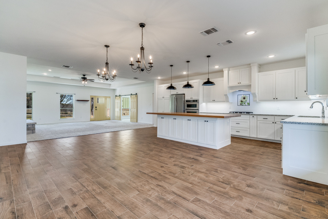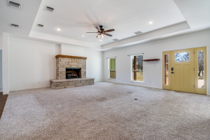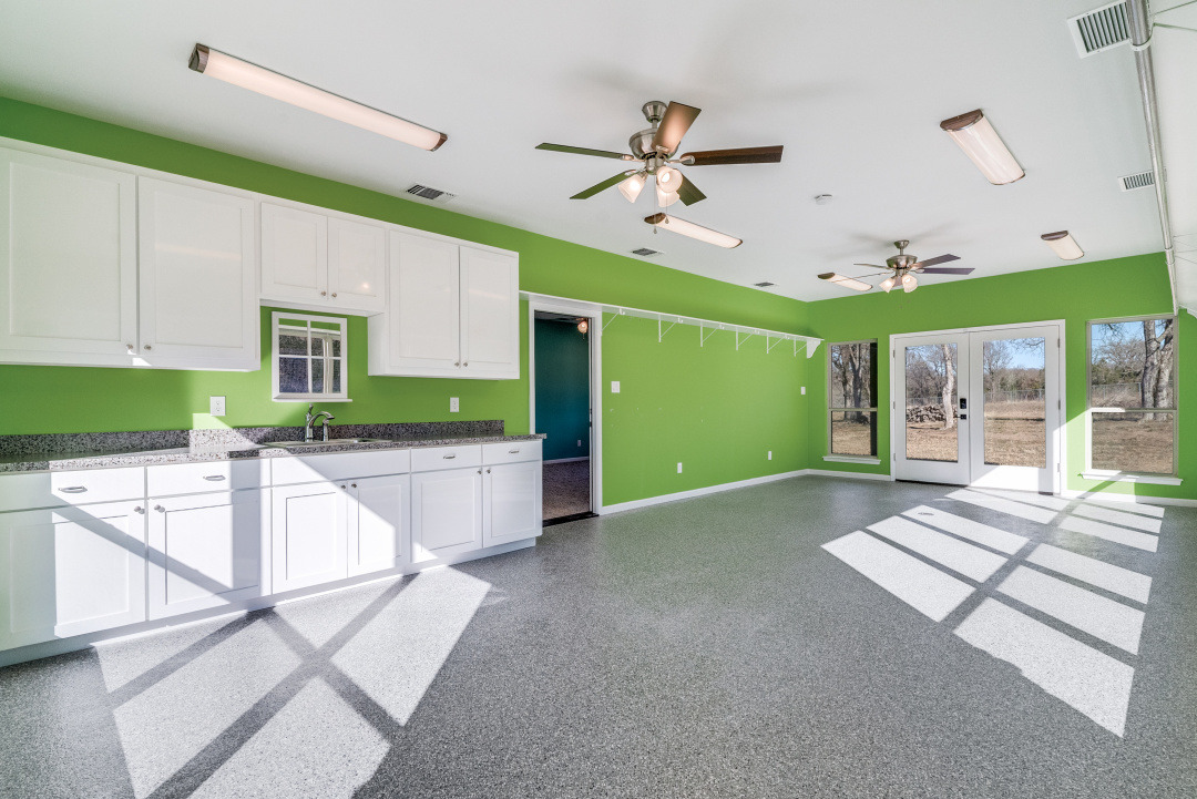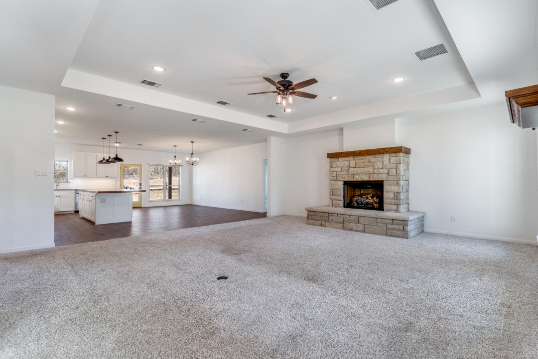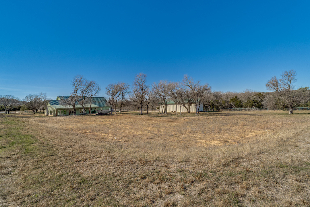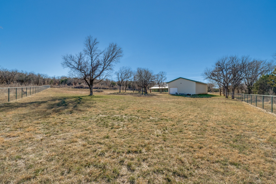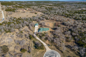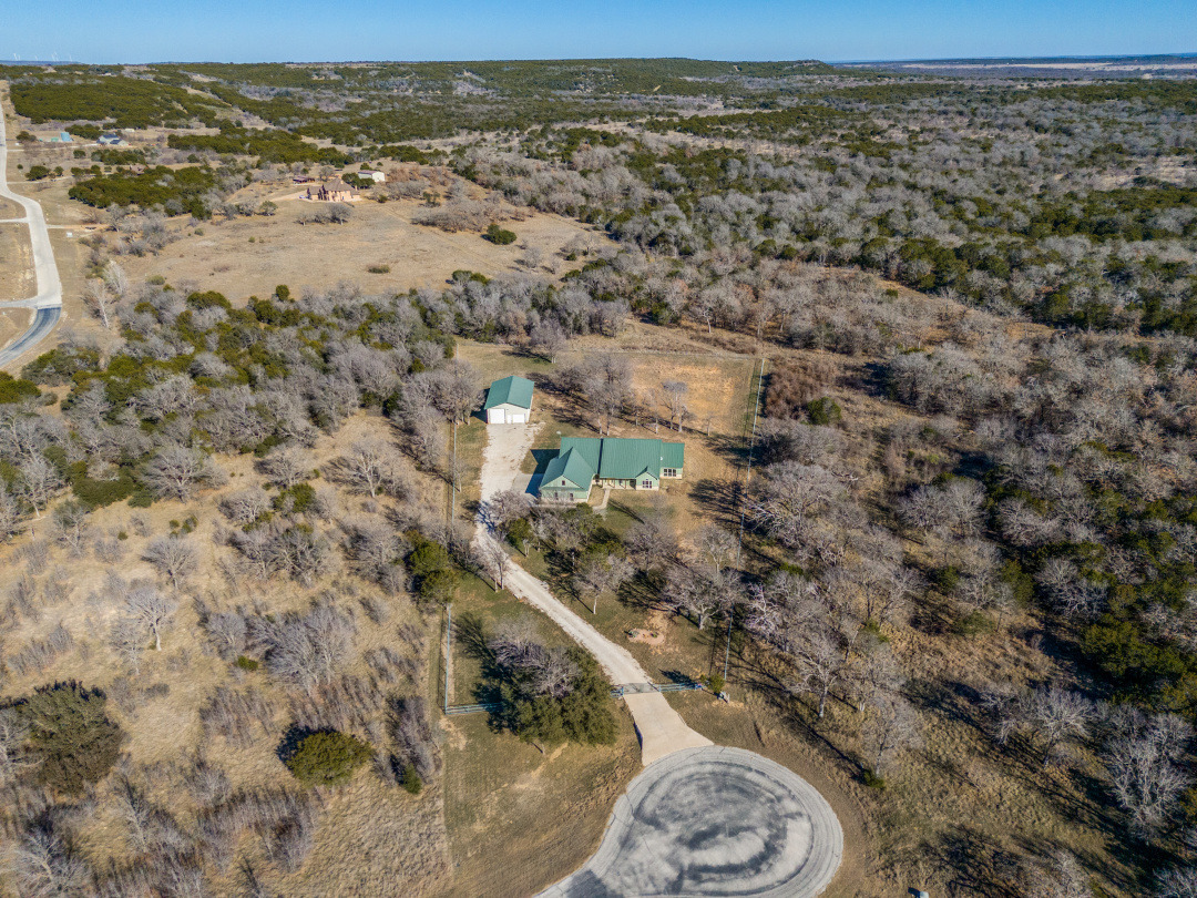 The front three acres are fully fenced with 5-foot fencing and hog wire buried one foot deep, designed to block feral hogs while allowing deer and turkey movement. A solar-powered automatic gate controls access. Built in 2022, the property was designed for long-term performance, resilience, and control. Construction includes an engineered slab with oversized beams and additional rebar, closed-cell foam insulation, and a hail-resistant metal roof. The home is fully wheelchair accessible and consists of a concealed FEMA-rated safe room. Mechanical systems feature Trane HVAC with heat pump and gas backup, ERV fresh-air exchange, whole-home dehumidifier, instant hot water loop, carbon water filtration, insulated PEX plumbing, LED lighting, and a Generac whole-house backup generator supported by a buried 1,000-gallon propane tank. The open floor plan includes an eat-in kitchen & living room anchored by a large stone gas fireplace. The kitchen features a gas range with hood, refrigerator, dishwasher, wall oven, microwave, and an ice maker. The laundry room includes a washer, dryer, and a full-size refrigerator. A bonus family room offers flexible use as a sunroom, game room, workout room, playroom, or craft room, complete with cabinetry and a sink. An oversized epoxy-coated 3-car garage includes an additional 500 sq ft of built-in storage cabinets. The covered back patio has a built-in gas grill and a sink. A 1,900 sq ft insulated, plumbed, and fully wired shop with an automatic RV-height door, front and rear overhead doors, water, internet, and hookups functions as a true secondary asset. This property is in The Hills Above Possum Kingdom with a community pool, clubhouse, workout center, dock. boat launch and boat storage.