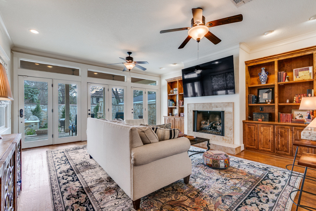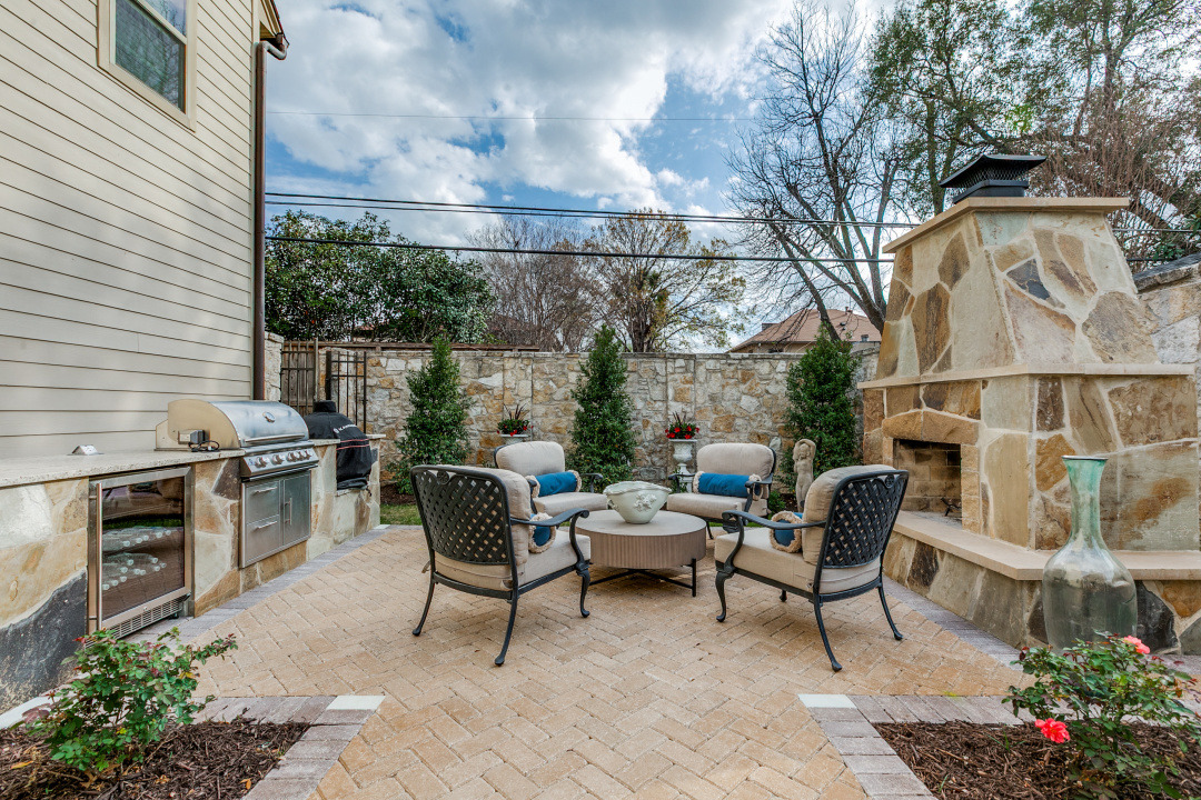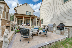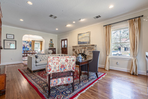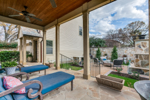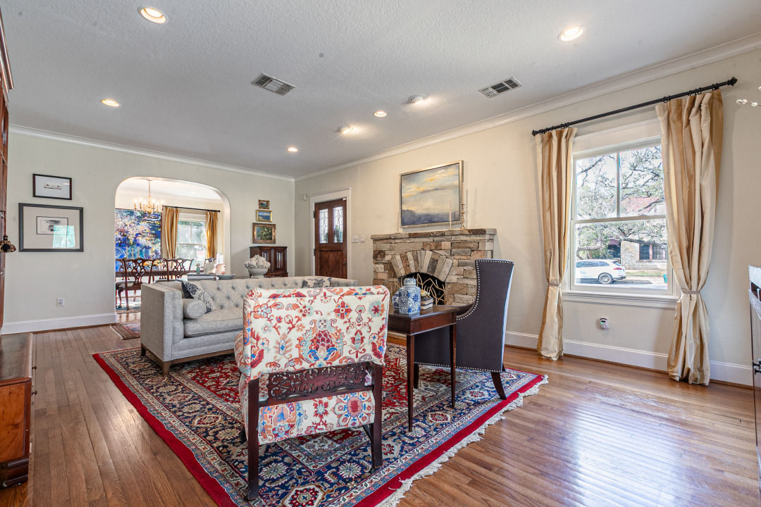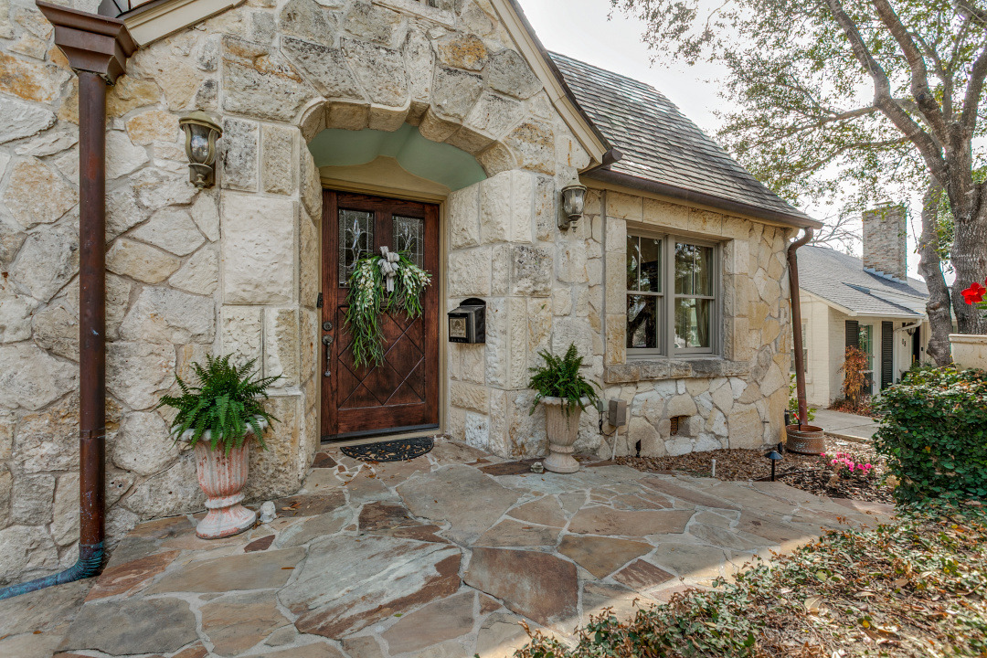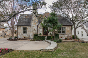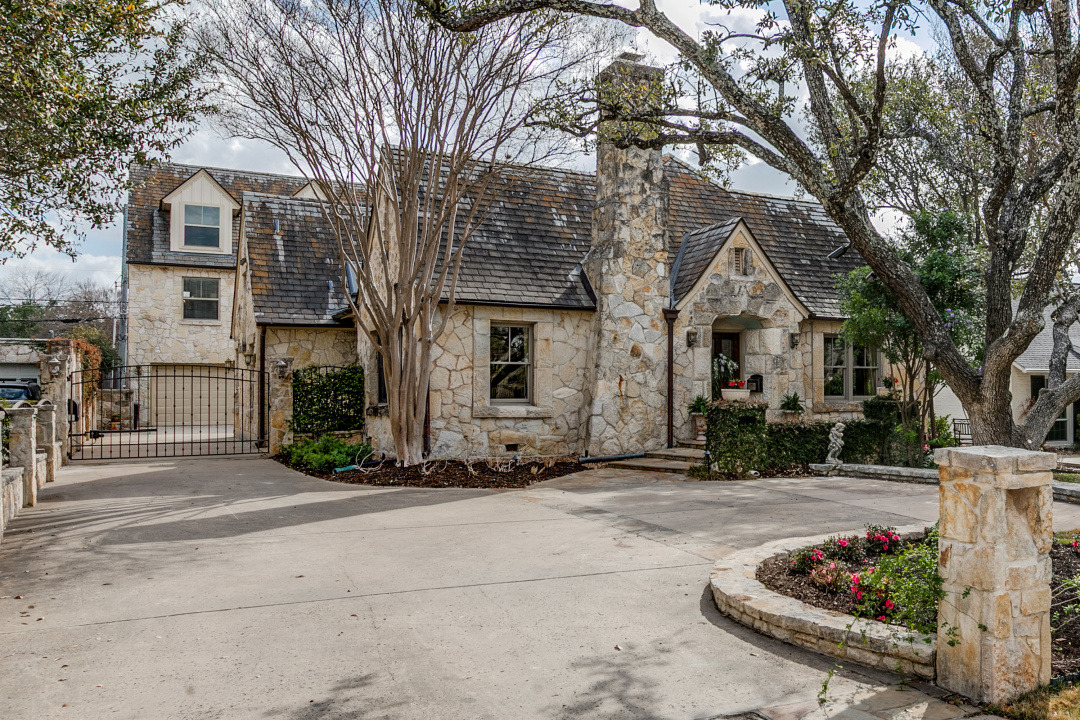 Charming Olmos Park home and guest apartment with 1925 stone façade, slate roof, and copper gutters, extensively updated in 2005 with high ceilings, newer windows, and a recently updated chef's kitchen open to a second living area; fireplaces in both the living room and family room. Primary suite downstairs with ensuite bath and walk-in closet. Upstairs offers two bedrooms with a large shared bath, built‑ins with desk, laundry, and a bonus room with large closet (ideal for playroom, nursery, or optional 4th bedroom—no window). Beautiful backyard patio with pavers, a stone fireplace and new outdoor kitchen.