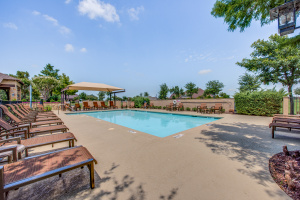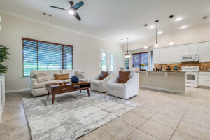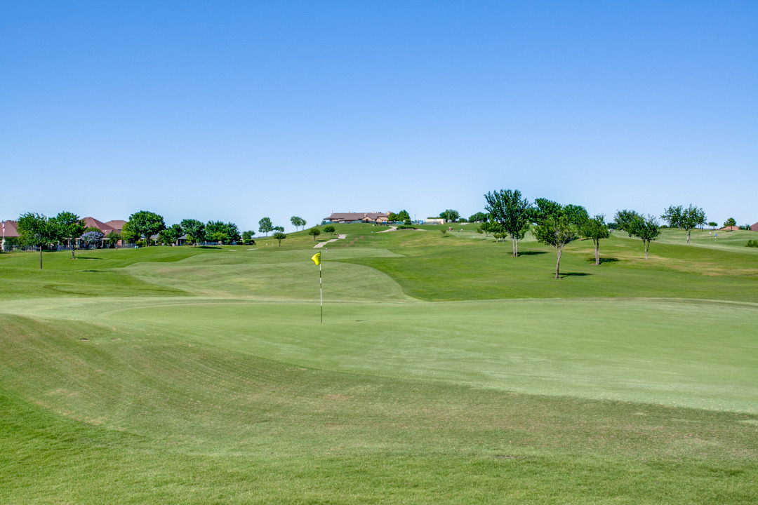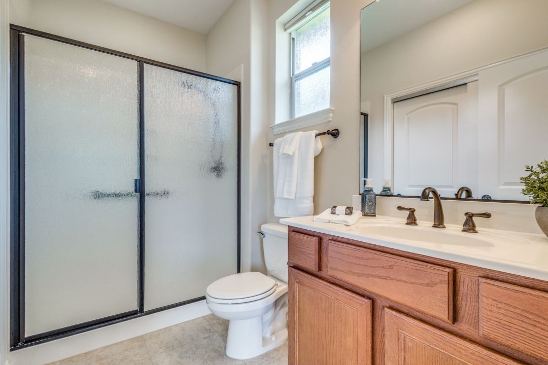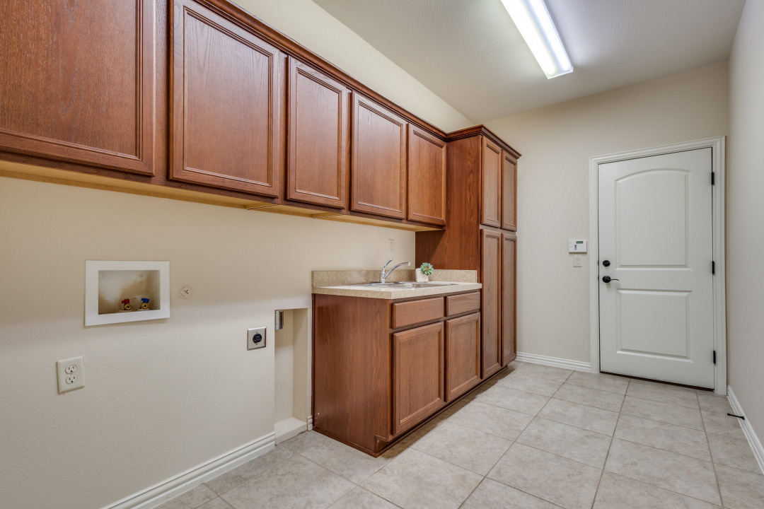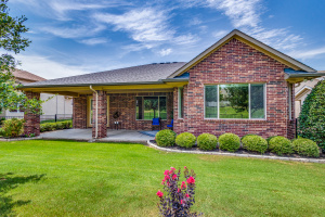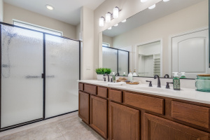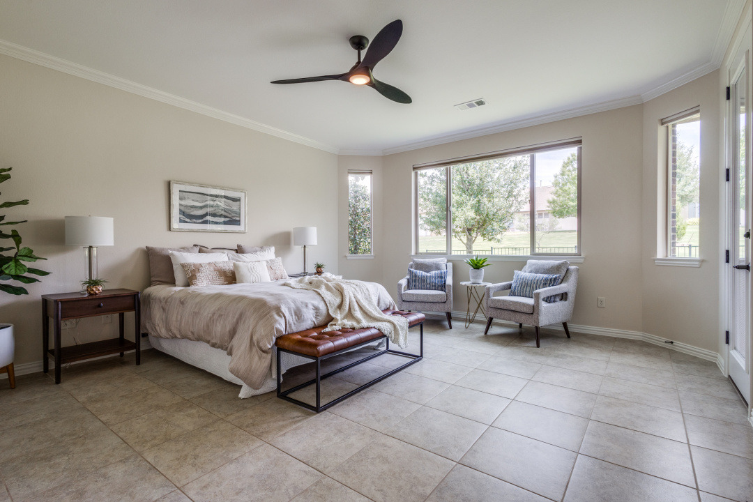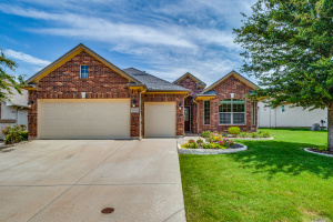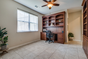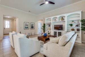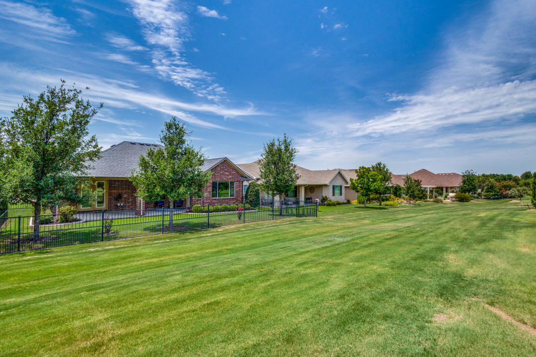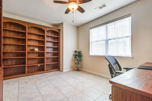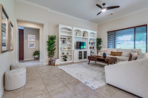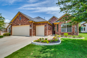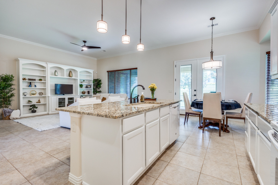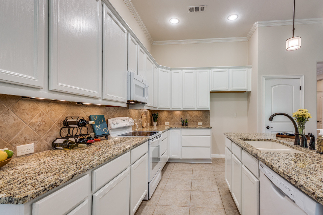 Gorgeous and Pristine describes this all brick exterior BRISCOE floorplan. Entire interior freshly painted along with the kitchen cabinets. Stylish designer light fixtures added. The recent updates make this home feel like a new home! Open floorplan shows off a comfortable living room area, gorgeous built-ins and views to the lovely backyard and greenbelt. Kitchen is bright and open with granite, a large island, under counter lighting and large walk in pantry. This model features a large Primary bedroom with ensuite and huge custom walk in closet. Second room has ensuite and the Office with classic built-in cabinets could easily be another bedroom if desired. Enjoy the large Laundry room with extra cabinets for storage, countertop and sink! Beautifully landscaped with covered back patio, gas stubbed for grill, fenced yard with puppy bars. 2 car garage plus golf cart storage. Resort style living includes pools, gym, golf, tennis, restaurant and more. Tons of community activities!