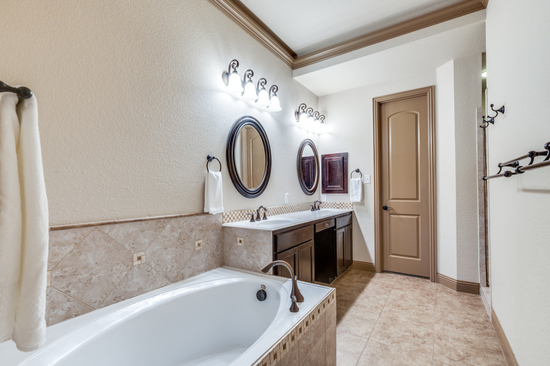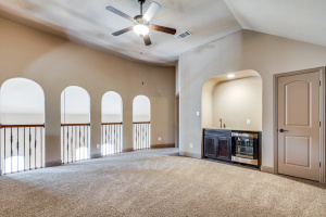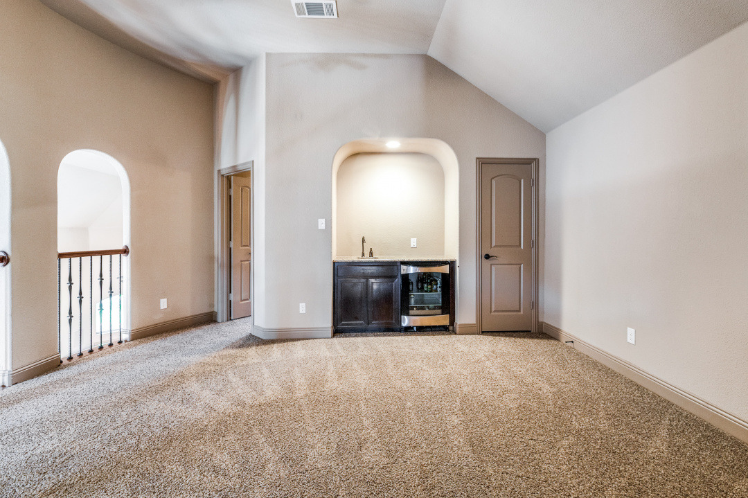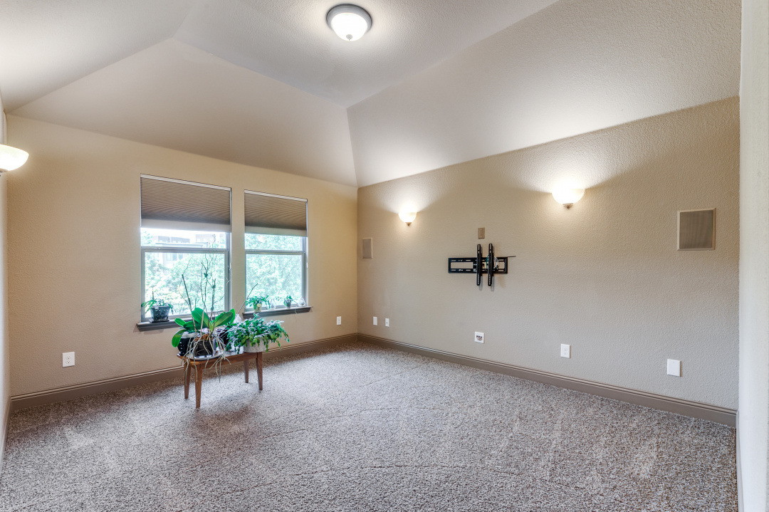 Fabulous villa home in the heart of Keller Town Center. Premium lot with water & greenbelt view. Easy access to miles of the Keller trails & park system. This 4 bedroom, 3 bath home features include a primary suite and guest suite down, open floor plan, granite counter tops, SS appliance, beautiful wood floors & finish out, soaring ceilings. Two additional bedrooms a game room with wet bar & a media room up. Walk thru the privacy gate to beautifully landscaped beds & walkway to the front door. Spacious patio in the back to take in the park & water views. These low maintenance, lock up and leave villa homes rarely go on the market. Shopping, dining, coffee shop, spa, concerts in the park & more are steps away. Approximately 200 sq feet of overheard storage in the garage with a lift, plus built-ins for extra storage.Laundry room with sink & cabinets.Sound system thru-out home & patio.