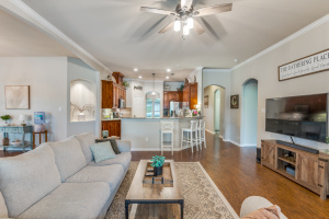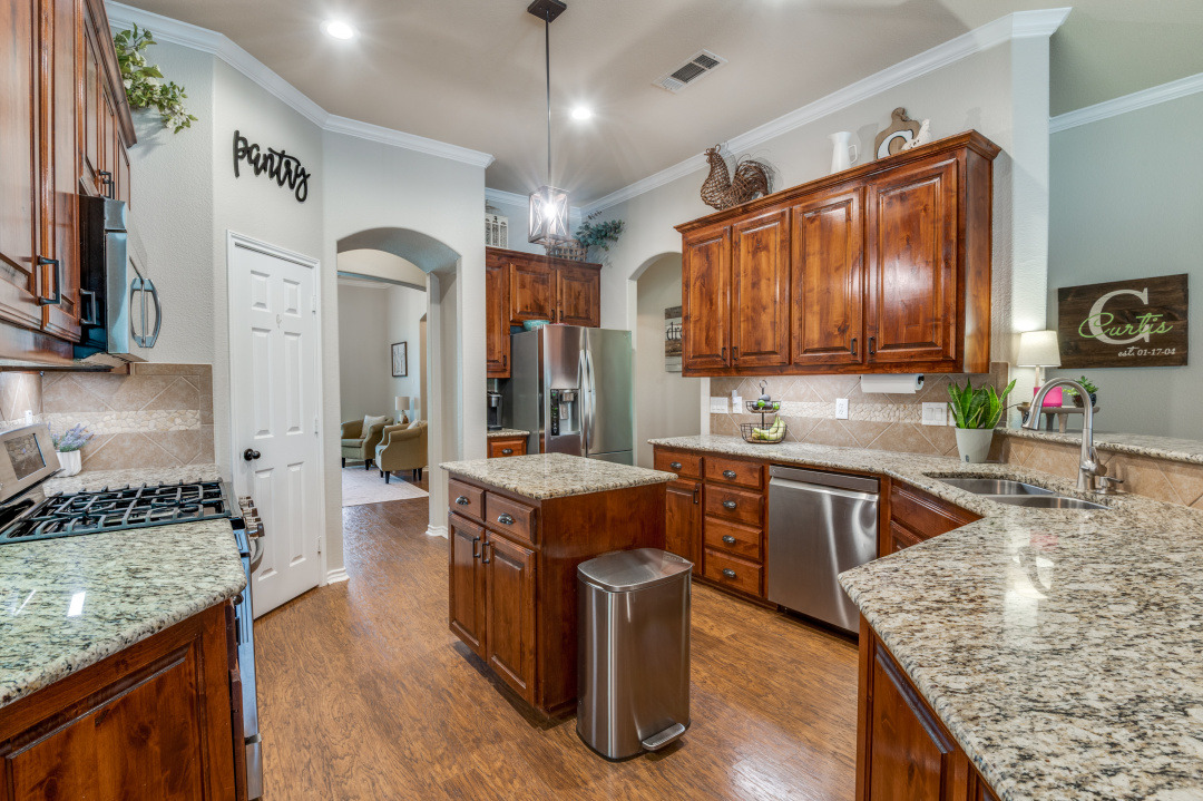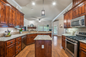 Inside, the open-concept kitchen is designed for both everyday living and entertaining, featuring granite countertops, stainless steel appliances, a gas range, and an oversized breakfast bar that flows seamlessly into the main living area. The private primary suite is thoughtfully split from the secondary bedrooms, creating a quiet retreat.