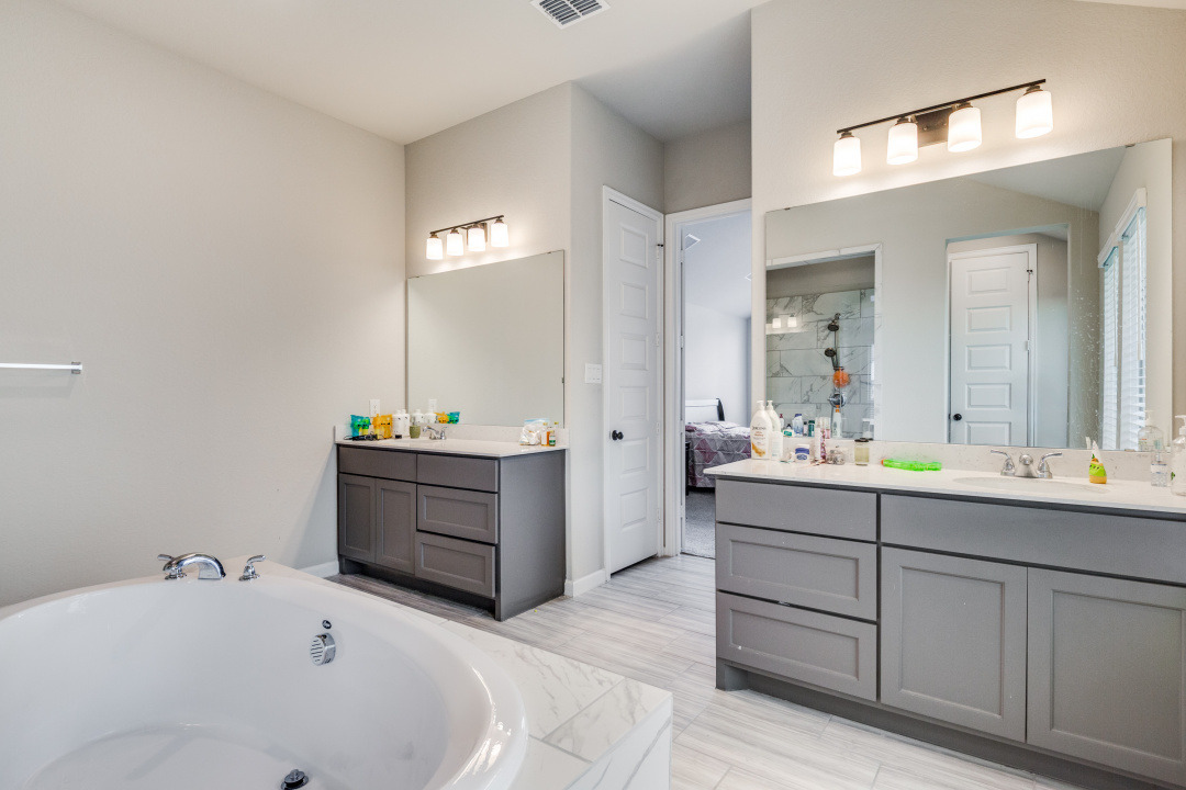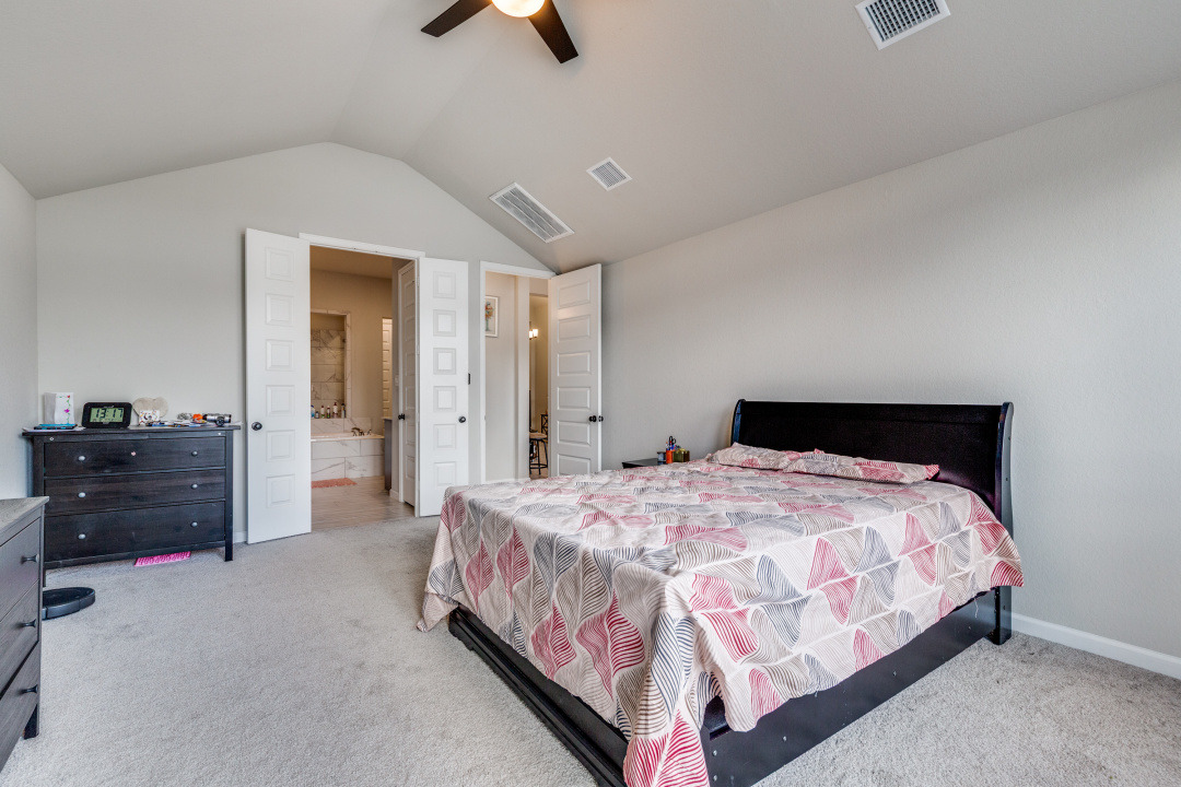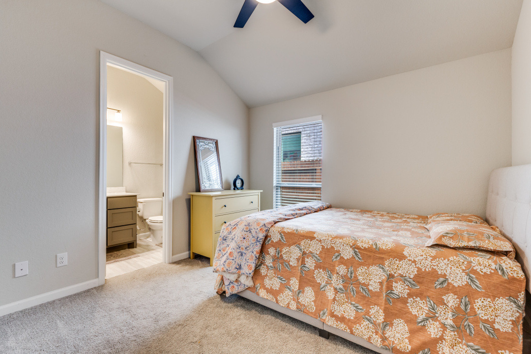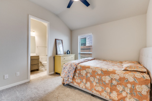 A private guest or mother-in-law suite includes its own full bath, while the luxurious primary suite boasts a spa-like bathroom with an oversized shower, separate garden tub, and generous walk-in closet.