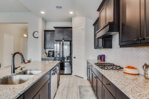 The gourmet kitchen is a chef’s dream, complete with an oversized granite island, built-in oven and microwave, and a drop-in cooktop—perfect for entertaining or everyday family meals.