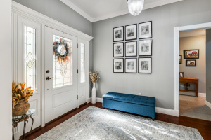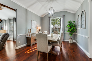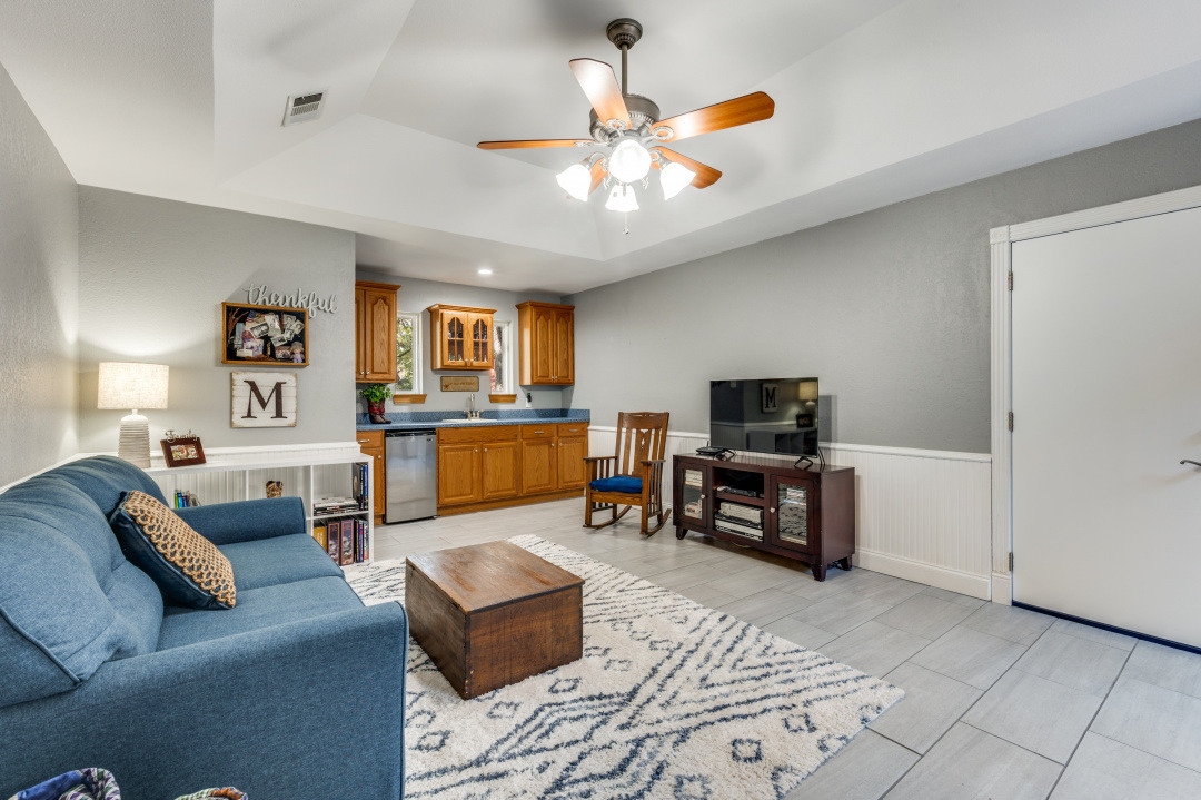 The home has undergone extensive updates, including a complete kitchen remodel in 2019 and a beautifully renovated primary bathroom in 2018. New windows throughout bring in abundant natural light and enhance overall energy efficiency. The open living areas and updated finishes create a warm, modern feel.