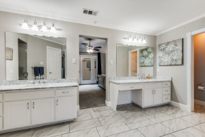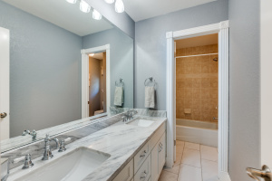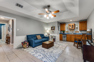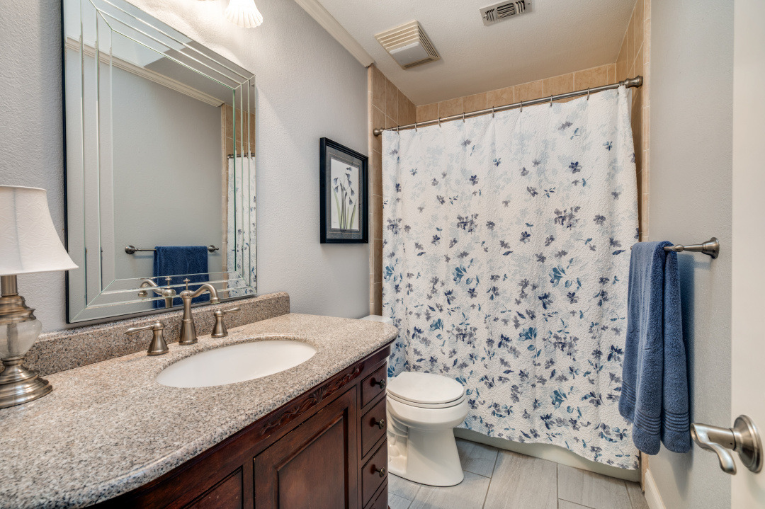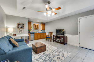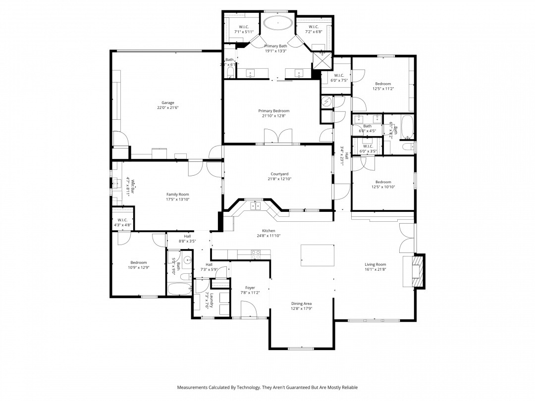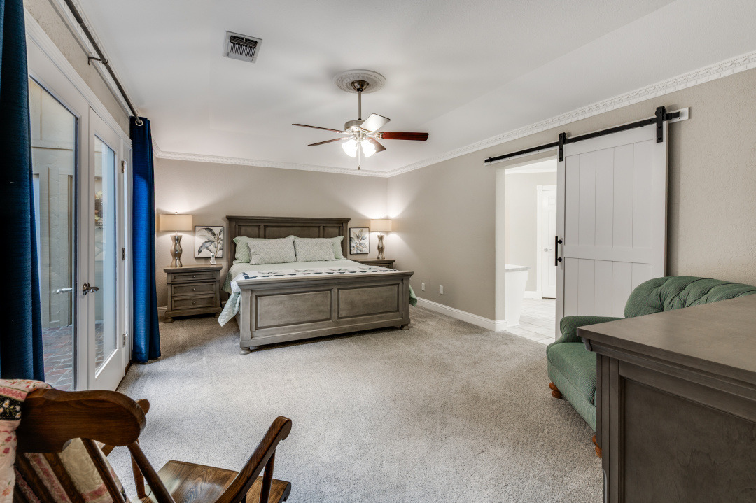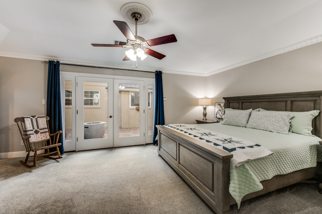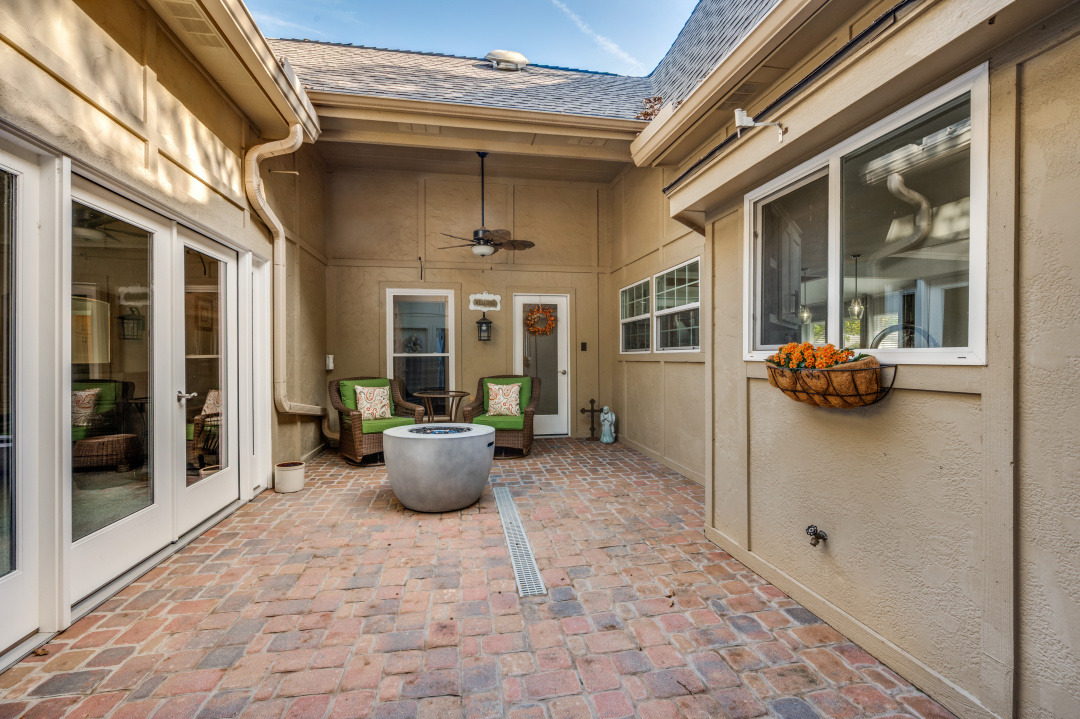 The split layout offers an ideal arrangement for families or guests, featuring a private guest bedroom and full bathroom located separately from the primary suite and other bedrooms. The primary bedroom opens directly into a unique central courtyard—an inviting, peaceful outdoor space perfect for morning coffee or relaxing evenings.