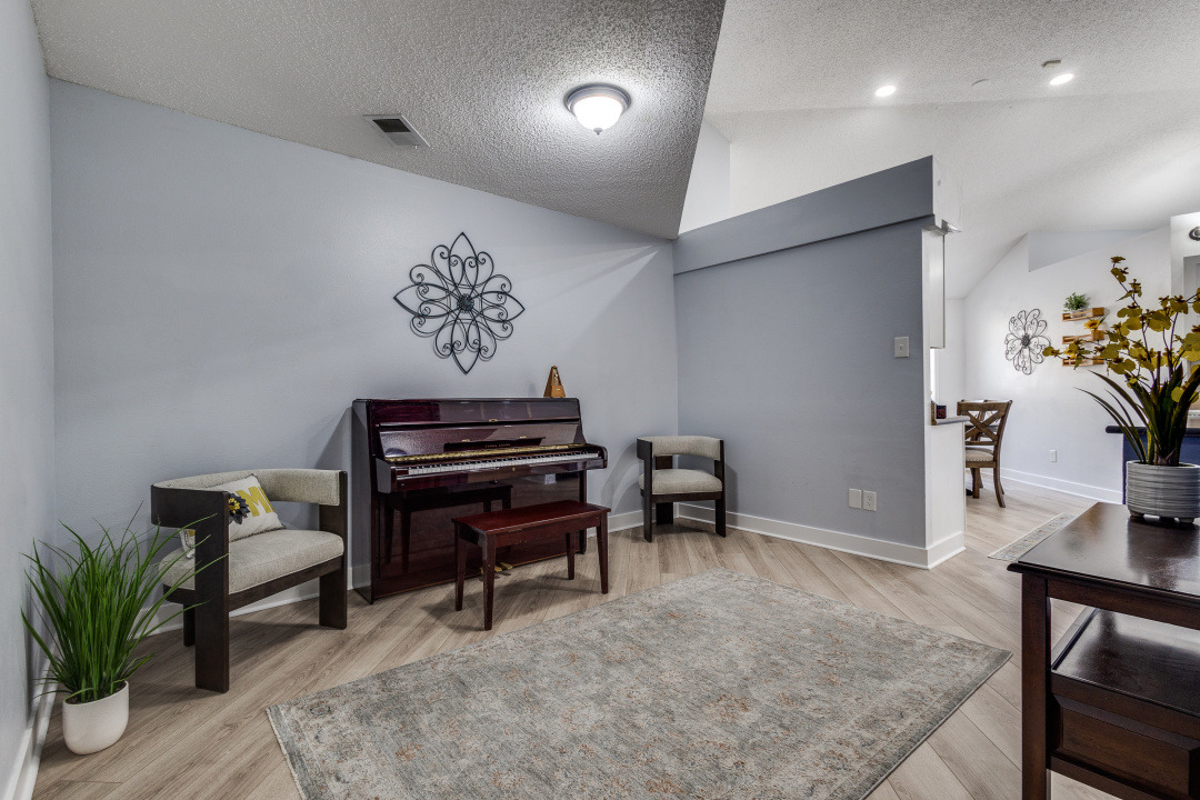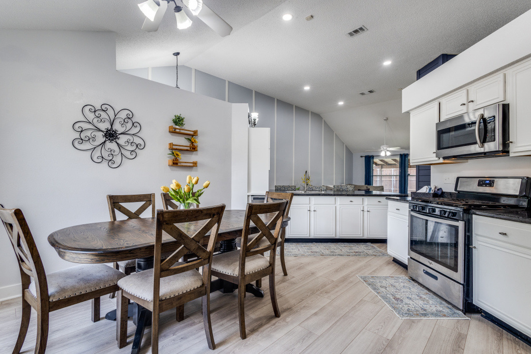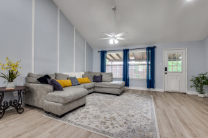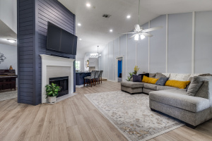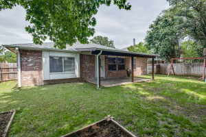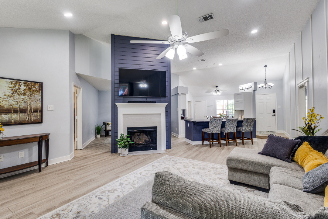Welcome to this beautifully updated 3-bedroom, 2-bath home offering comfort, style, and versatility. Step inside to an open-concept layout featuring brand new laminate flooring (installed 3/25) and ceramic tile throughout. The spacious living room boasts vaulted ceilings and a stunning custom tongue-and-groove surround on the fireplace-perfect for cozy evenings. Just off the kitchen, a versatile flex room provides the perfect space for a home office, playroom, or formal dining area. The kitchen and living areas are enhanced by updated lighting, including sleek can lights and modern ceiling fans. This is a split bedroom plan. Bathrooms feature custom open shelving for storage or linens and products. Outside, enjoy a large, covered patio ideal for entertaining or relaxing while overlooking the shaded, private backyard complete with a playscape. Additional features include a side-swing driveway, small storage shed, and plenty of charm inside and out.