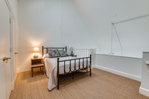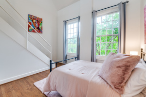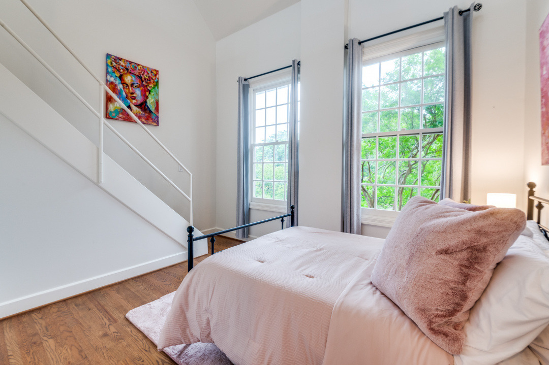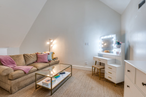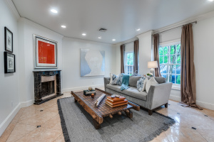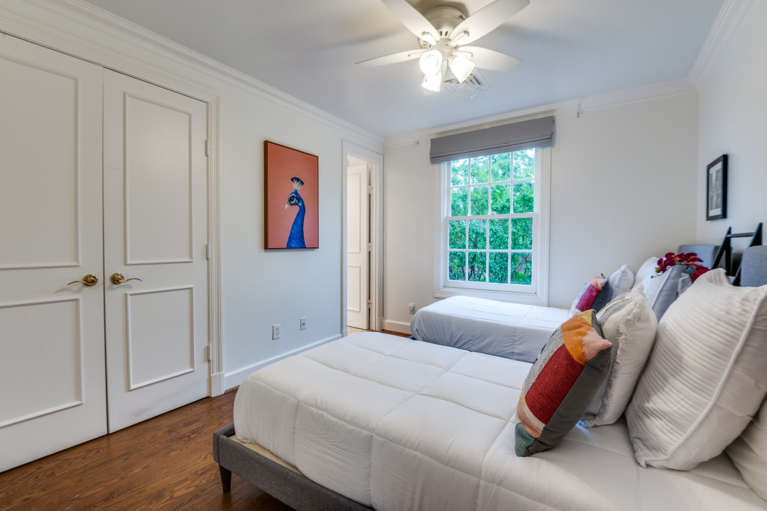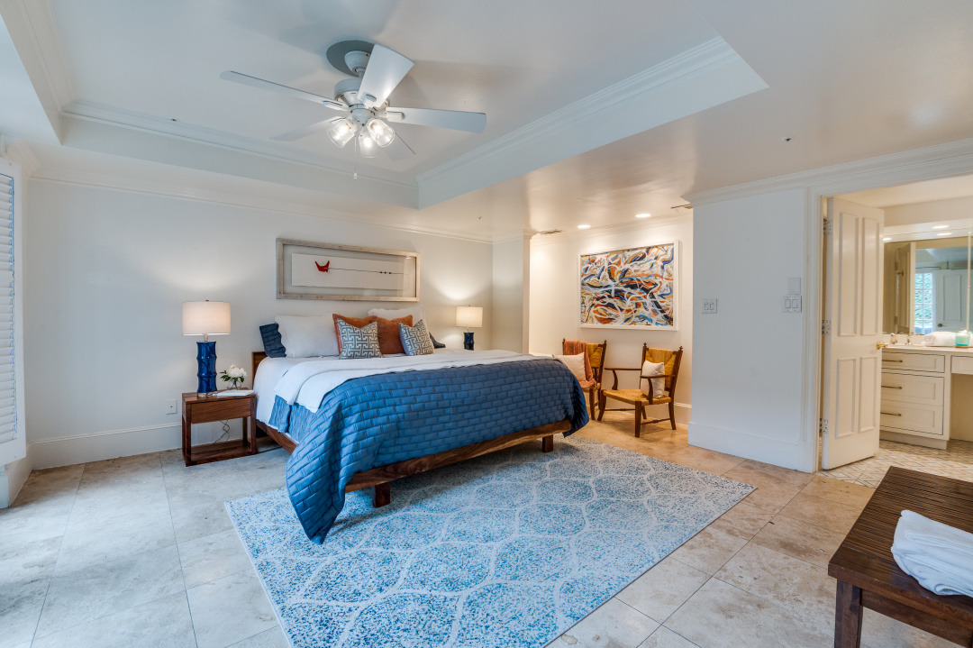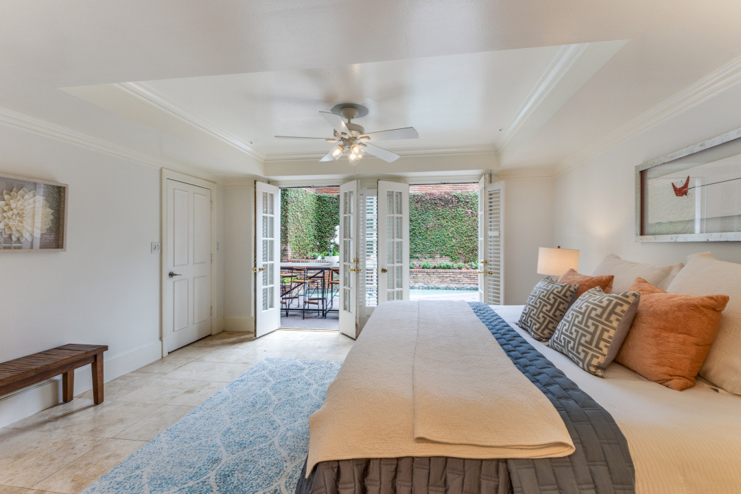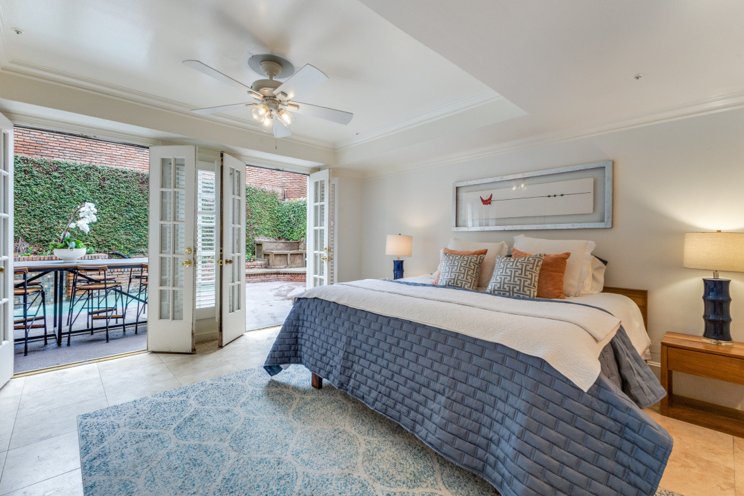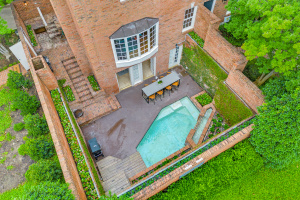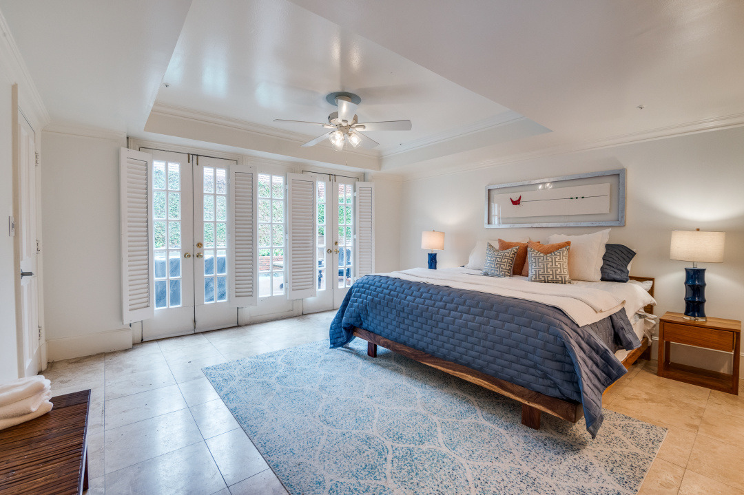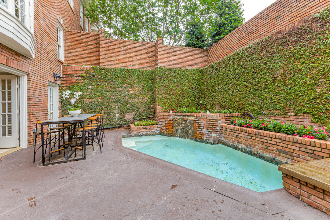The first-floor primary suite opens through French doors to a serene private pool and courtyard, thoughtfully situated below street level for enhanced privacy and year-round enjoyment. Upstairs, two secondary bedrooms feature charming loft spaces, perfect for study or relaxation, along with a private library and an additional flexible loft area.