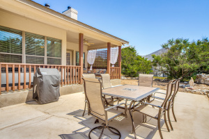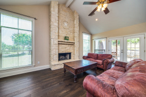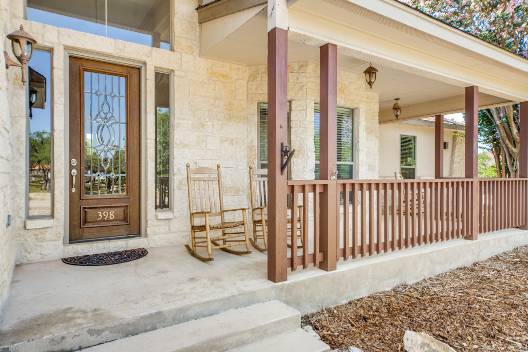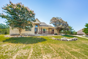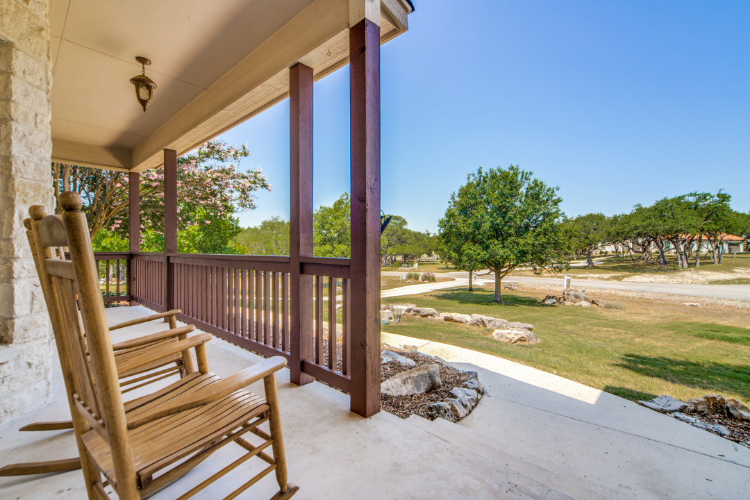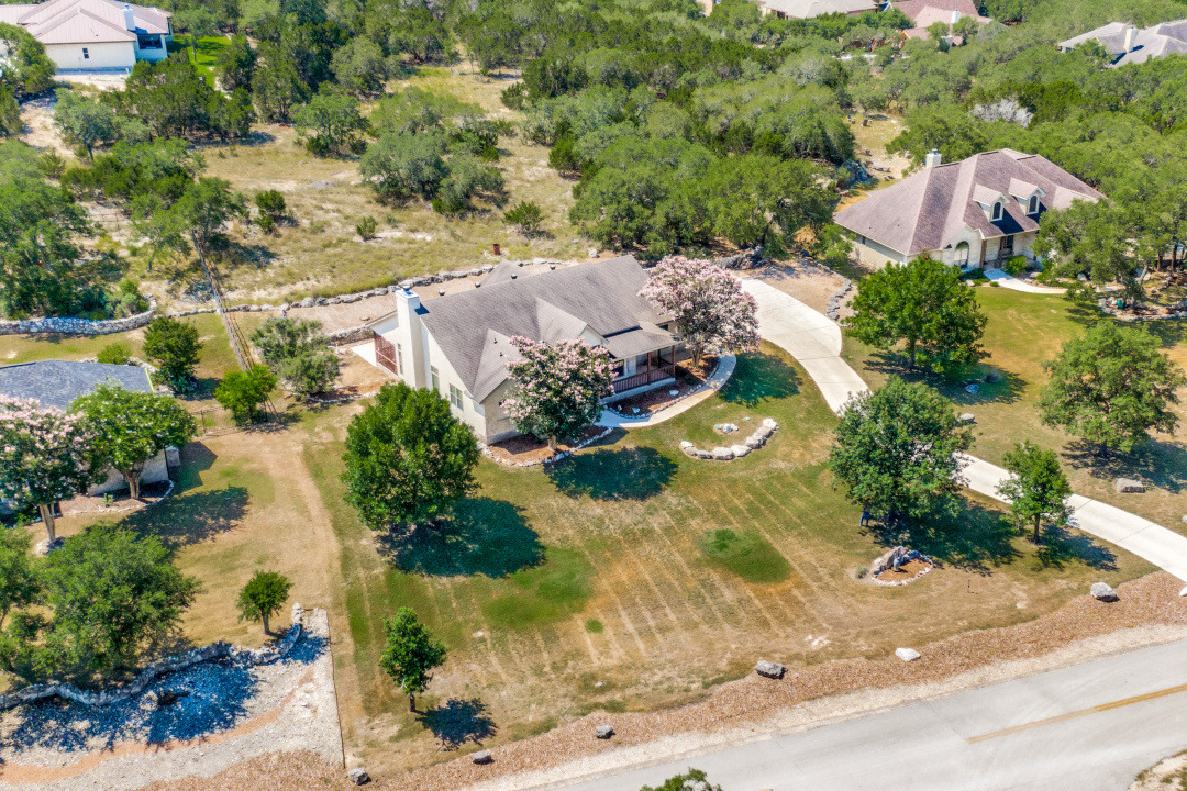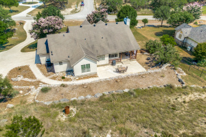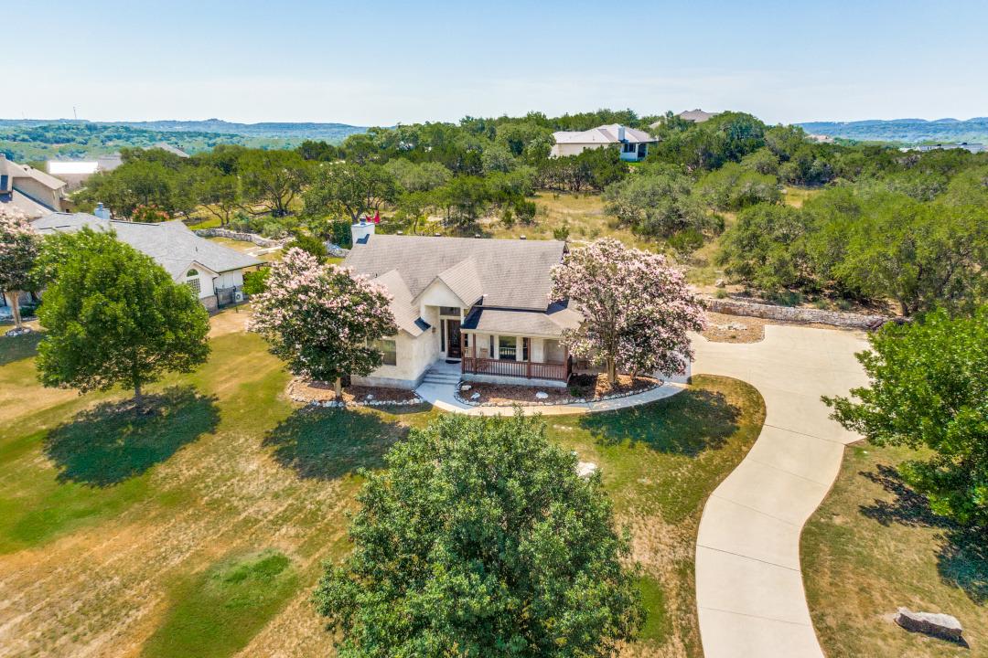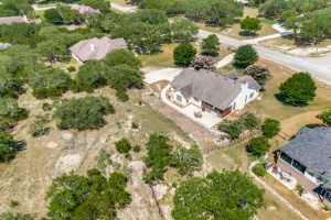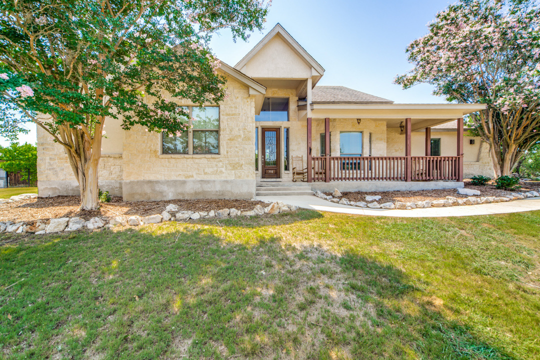 One story TX Hill Country home with high ceilings, limestone accents, and crown molding custom finishes. 3b/2b with private home office and formal living that can be used as flex-spaces. Great-room with floor to ceiling rocked wood-burning fireplace and cathedral ceilings opens to chefs kitchen with granite counters, center island, stainless appliances and bar seating. Split master retreat with cathedral ceilings and wood flooring. Large master bath with slate and granite detail, jetted soaking tub and separate walk-in shower. Tons of storage. Covered front and back porches with hill country views!