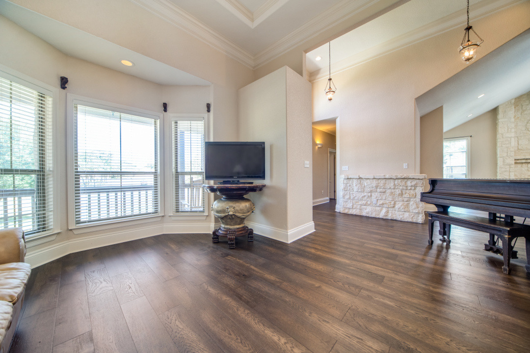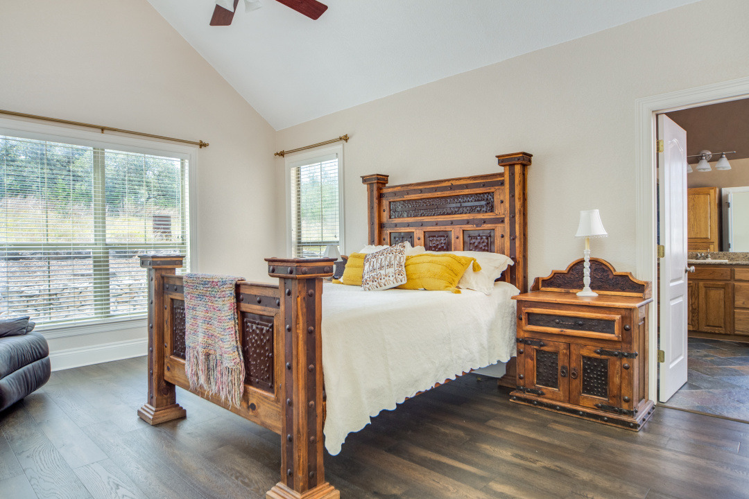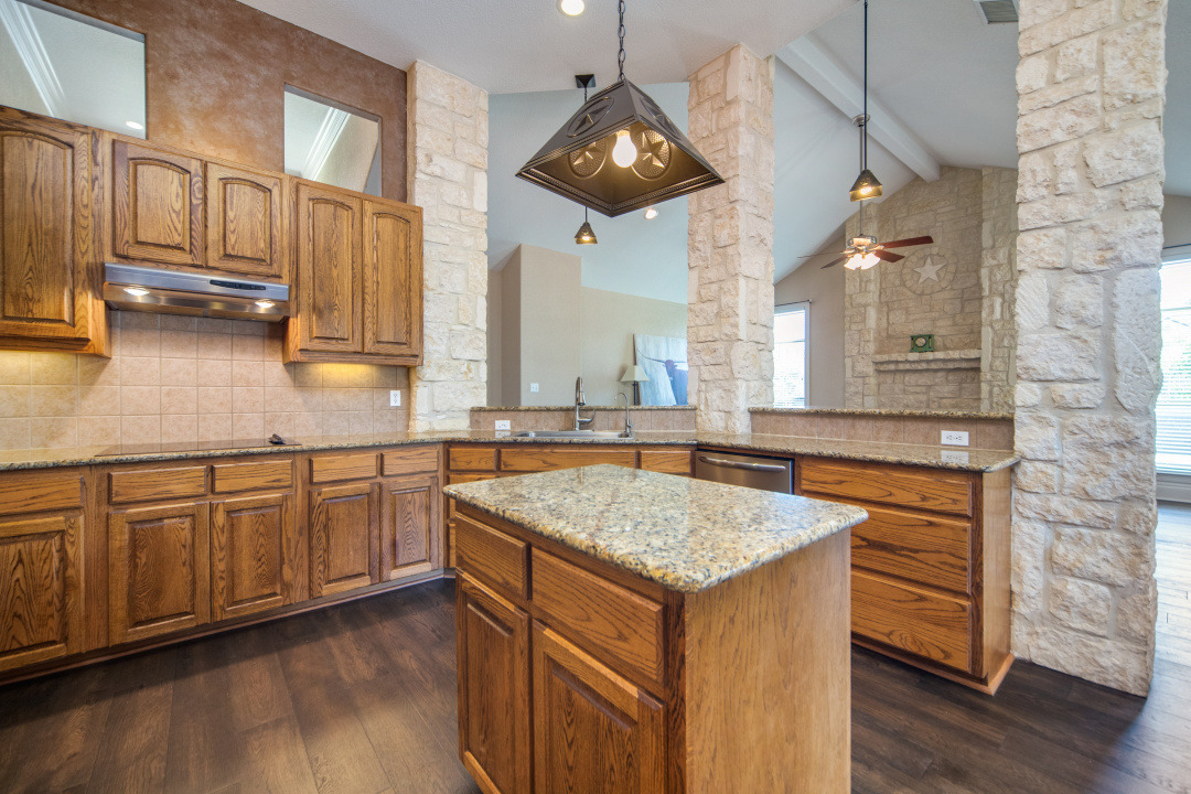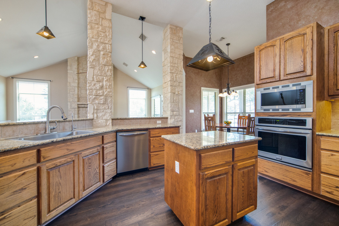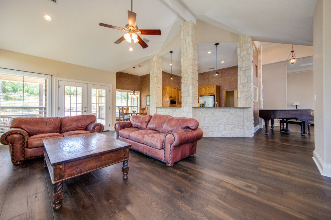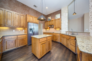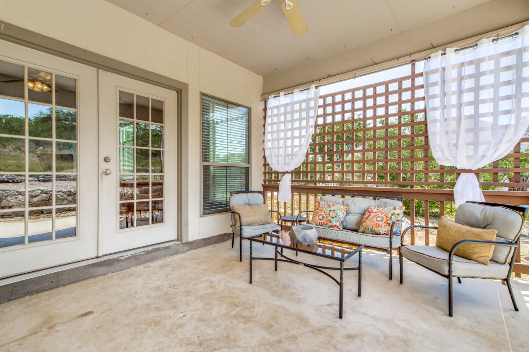 One story TX Hill Country home with high ceilings, limestone accents, and crown molding custom finishes. 3b/2b with private home office and formal living that can be used as flex-spaces. Great-room with floor to ceiling rocked wood-burning fireplace and cathedral ceilings opens to chefs kitchen with granite counters, center island, stainless appliances and bar seating. Split master retreat with cathedral ceilings and wood flooring. Large master bath with slate and granite detail, jetted soaking tub and separate walk-in shower. Tons of storage. Covered front and back porches with hill country views!