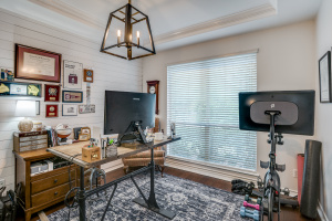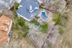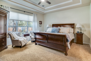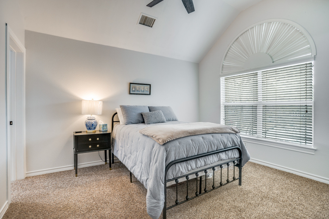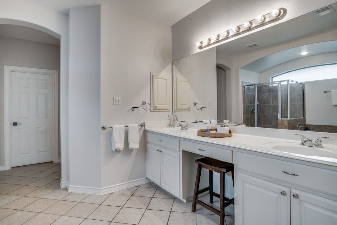 The downstairs primary suite offers privacy and space with a tray ceiling, garden tub, separate shower, double vanity, and walk-in closet. Upstairs you’ll find three generously sized bedrooms—each with walk-in closets—plus a large game room with a picture window overlooking the pool, backyard, and greenbelt.