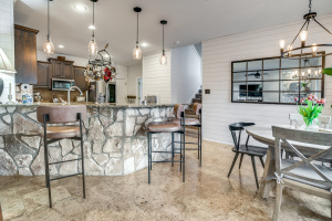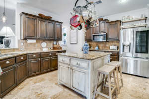 The kitchen anchors the home with Granite countertops, a center island with breakfast bar, stainless KitchenAid appliances, walk-in pantry, and distinctive travertine flooring. It opens naturally to the main living areas and flows toward the backyard—making it easy to cook, host, and stay connected.