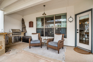 Step outside and the lifestyle becomes clear. A vaulted covered patio and outdoor kitchen with gas grill and sink overlook the in-ground pool with fountains, Polaris sweep, outdoor shower and a recently replaced energy-efficient pump. It’s the kind of backyard that turns weekends into stay-at-home retreats.