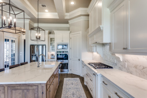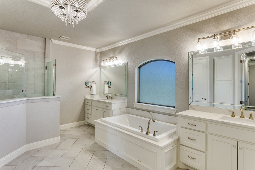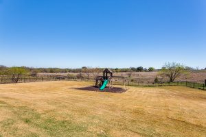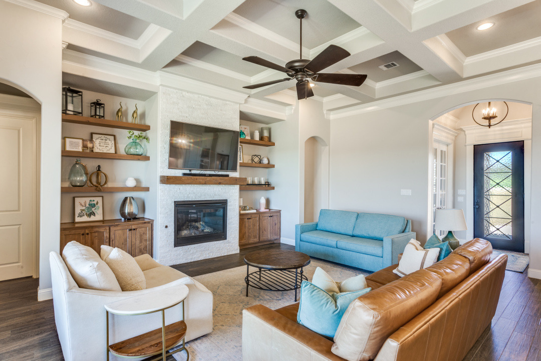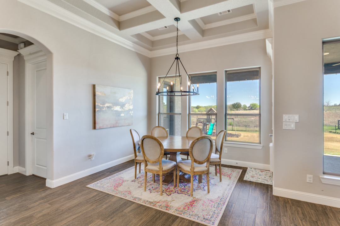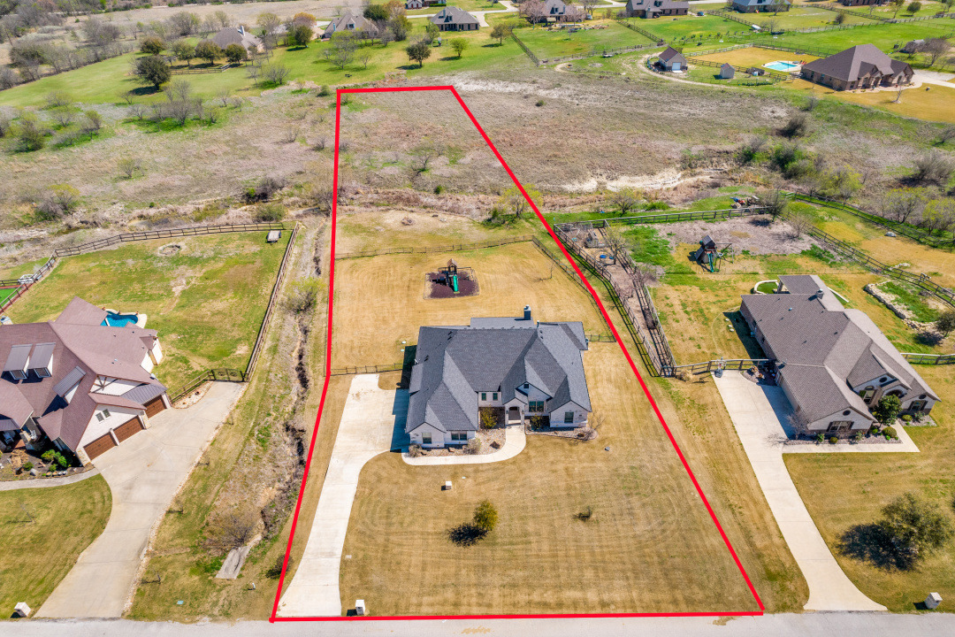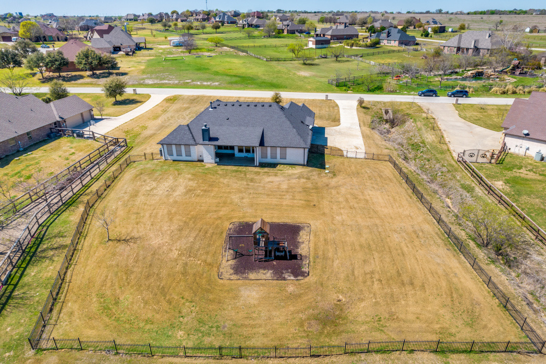 Excellence radiates throughout this impressive home custom built by Couto Homes. Located in the desirable Mustang Creek Estates. It includes luxury upgrades, classical architectural, and designer touches. Upon entry, one is greeted with a high barreled ceiling and arched walk through. The office to the right is a surround of soothing blue hue with vaulted box ceiling providing a private space for work and creativity. A coffered ceiling adds elegance and structural style to the open living, kitchen, and dining areas. Built-in shelves and cabinets flank a stone fireplace. An expansive wall of windows looks over the tranquil 2-acre lot inviting the outdoors in. The stylish kitchen features double ovens and oversized island delivering added convenience. Quartz countertops and marble backsplash compliment the sophisticated cabinetry. The oversized walk-in pantry is a bonus and extends around the corner into an L shape. The primary bedroom is separated from the secondary bedrooms. It features vaulted box ceiling, an outdoor entrance, and plantation shutters. The primary bathroom is a spa-like oasis with dual vanities, tub, and an oversized walk-in shower with dual shower heads. Two secondary bedrooms are split from the other with hall bathroom. The third secondary bedroom is an oversized 272 sq. ft. room with access to a hall bathroom. It could easily serve as a family room, media room, or guest suite. The thoughtfully designed utility room includes storage and large sink. It leads to the 3-car garage with epoxy floor. One garage space is separated from the other two. This allows the flexibility to use the space as a workout room, workshop, or more. On over two acres with a large wrought iron fenced backyard, this property has a plethora of opportunities. The covered back porch and woodburning fireplace make an ideal outdoor retreat.