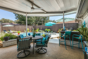 Beautifully updated single-story home in Buckner Terrace featuring 1,984 sq ft of living space, 3 bedrooms, 2.5 baths, and multiple living and dining areas. The spacious family room offers vaulted ceilings and a stunning stacked stone gas fireplace, opening seamlessly to a modern kitchen with white cabinetry, quartz countertops, and a large peninsula perfect for dining and entertaining. Engineered hardwood floors flow throughout the main living areas, with carpeted bedrooms and updated bathrooms featuring modern tile. The primary suite includes an electric fireplace, recessed flat-screen TV, dual closets, and a luxurious ensuite bath with dual sinks, soaking tub, and separate shower. The guest bedrooms are spacious with large closets and share a jack-n-jill updated bath. A custom utility room offers built-in cabinets, washer & dryer, and additional pantry storage. All closets are outfitted with ELFA shelving for optimal organization. The backyard is an entertainer’s dream with an 8-ft wood privacy fence, sparkling pool with tanning ledge and water feature, a covered patio with outdoor bar, dedicated pet turf area, and a powered Tuff Shed for extra storage. The oversized 2-car rear-entry garage features an insulated door and is accessed via an electric gate. The landscaped yard includes a full sprinkler system for easy maintenance.