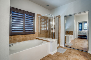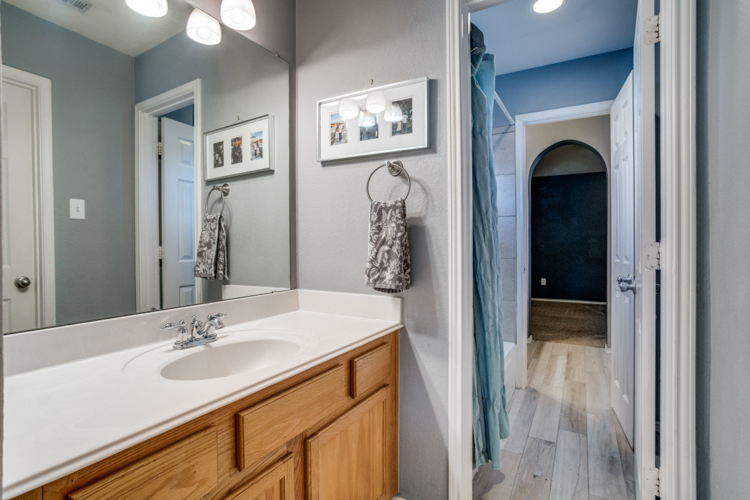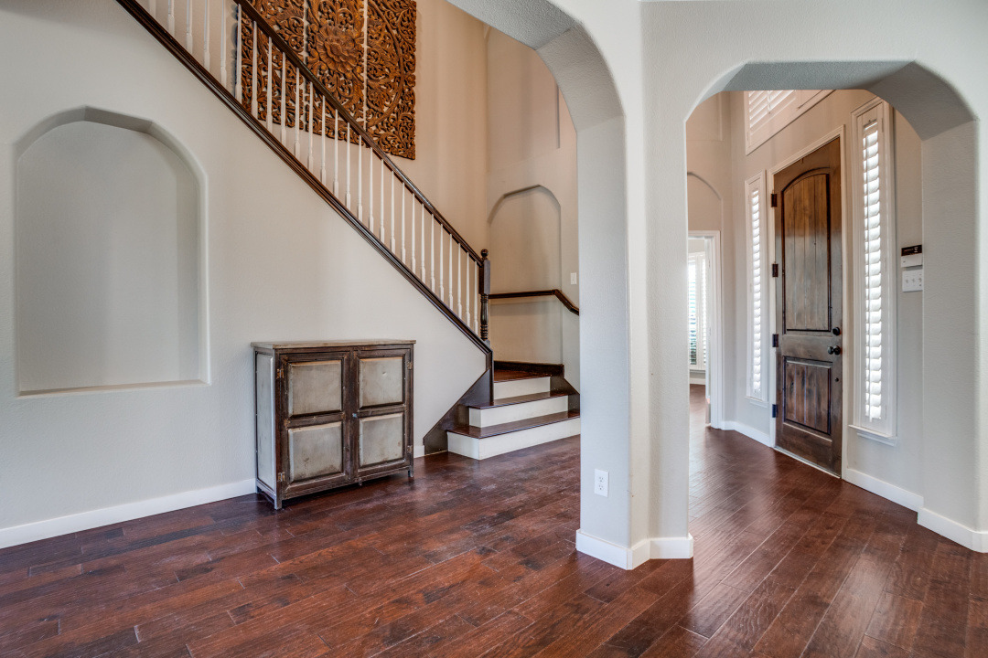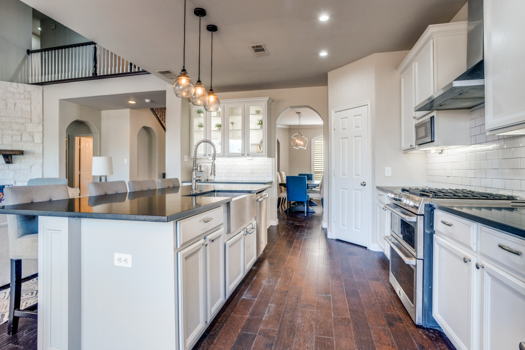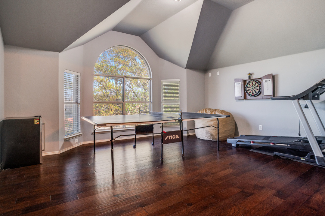This Frisco stunner lies on a HUGE PRIVATE LOT that surrounds a gorgeous POOL with attached SPA. Tastefully updated island kitchen, with farmhouse sink, is equipped with loads of counter and cabinet space, plus stainless-steel appliances that include a 6-burner gas smart range that vents to the outside. Spacious breakfast nook adjoins. Open to the kitchen and nook is an enormous living area with stone corner fireplace. A wall of windows provides an abundance of natural light to the whole configuration, with an updated downstairs guest bath serving the lot. Adjacent to the kitchen is a large formal dining area. Also downstairs is a Texas-sized primary bedroom and bath. The tiled primary bath encompasses a separate shower and garden tub, dual sinks, vanity, and walk-in closet. The upstairs retreat boasts two big bedrooms connected by a jack-and-jill bath, and across a dramatic catwalk lies a giant game room, massive media room, and an additional bedroom with another full bath. Architectural accents and art niches abound while delicious hardwoods adorn most of the home except for the secondary bedrooms, baths, and utility room. Beautiful plantation shutters outfit the front and primary bedroom and bath. Lying nestled in the middle of the massive back yard is a heated pool with attached spa. Tons of decking surrounds the pool and spa, while a large open patio provides panoramic views of the whole scene. Lots of room for entertaining, while no neighbor looms over! Served by award-winning Frisco ISD and complemented by easy access to both Sam Rayburn and the Dallas North Tollway, in addition to a multitude of restaurants and entertainment venues, this area is a real winner!