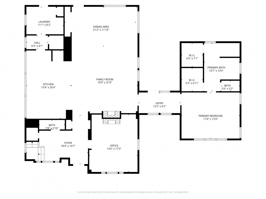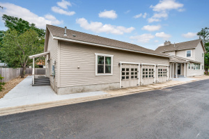 The main house includes 3 bedrooms and 2.5 baths, plus a large downstairs office with fireplace and built-in bookcases. Additional living space is located in the upstairs loft. The open living, dining, and kitchen areas feature a second fireplace with built-ins.