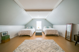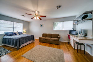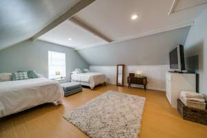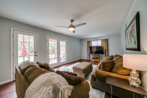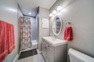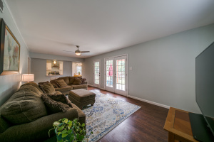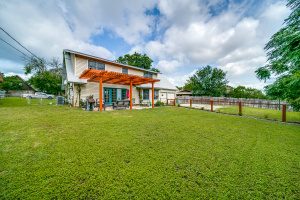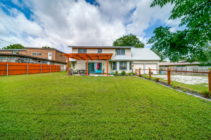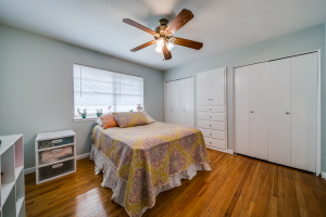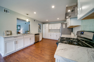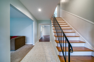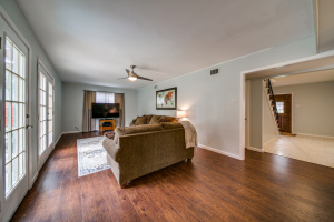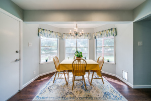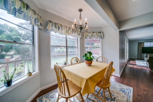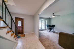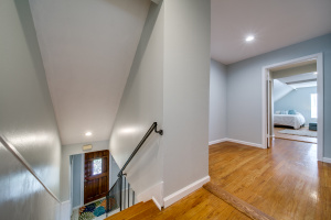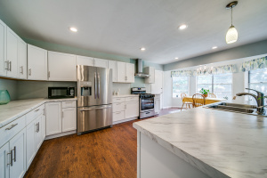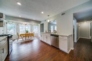 Gorgeous wood laminate floors downstairs, and wood floors on stairs, and in two of the bedrooms upstairs, wood laminate in third. Master downstairs. Redone kitchen with beautiful new cabinets and appliances. Eat-in kitchen overlooking fenced backyard. 2-car garage, rear entry.